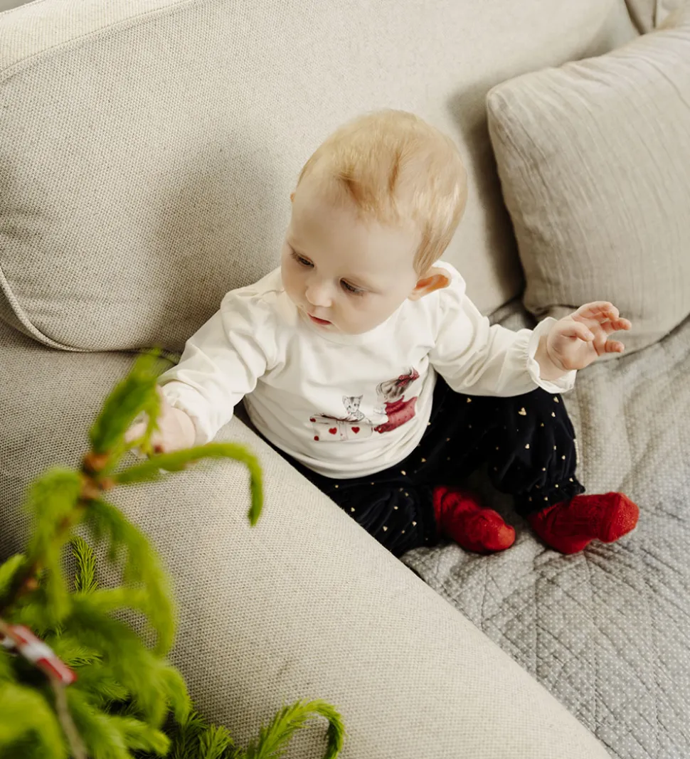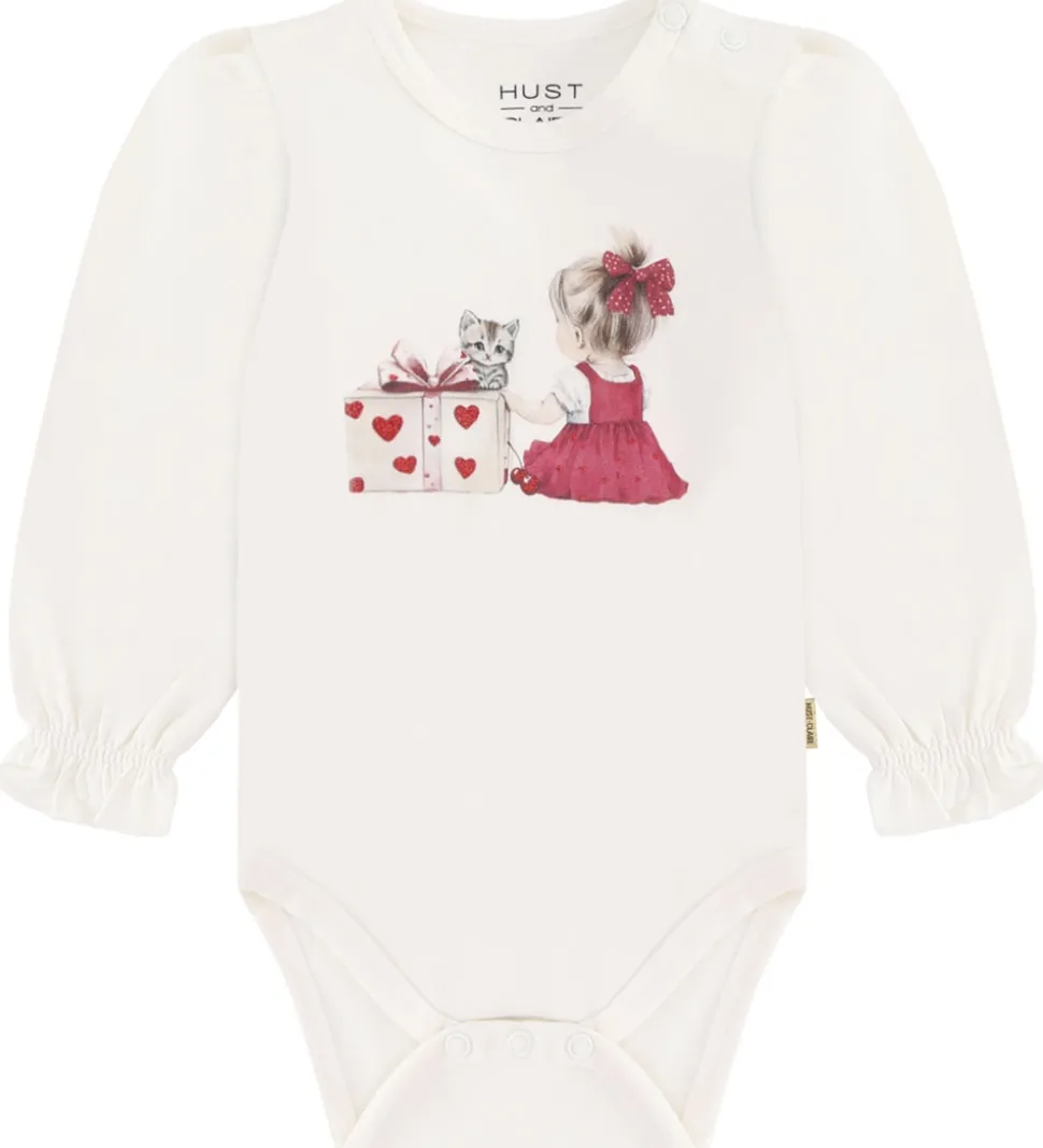 Dejlig Hust and Claire body med lange ærmer i en blød hvid farve. Bodyen har et sødt print af en pige med en kat ved siden af en gave med hjertemønster. Det feminine udtryk understøttes af smukke flæsedetaljer ved ærmeenderne.