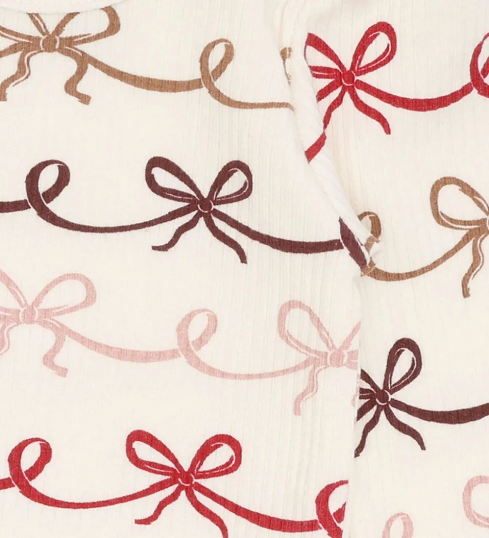 Elegant Hust and Claire body med lange ærmer i en blød, off-white nuance dekoreret med et charmerende sløjfemønster i forskellige røde og brune toner. Hust and Claire formår at skabe en fin balance mellem farverne, der giver et klassisk udtryk.