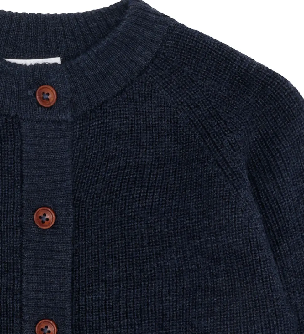 Klassisk Hust and Claire cardigan i navyblå strik. Cardiganen har en rund halsudskæring og gennemgående, brune knapper fortil. Den har lange ærmer og ribkanter i alle åbninger. Blusen er fremstillet af 100% merinould.