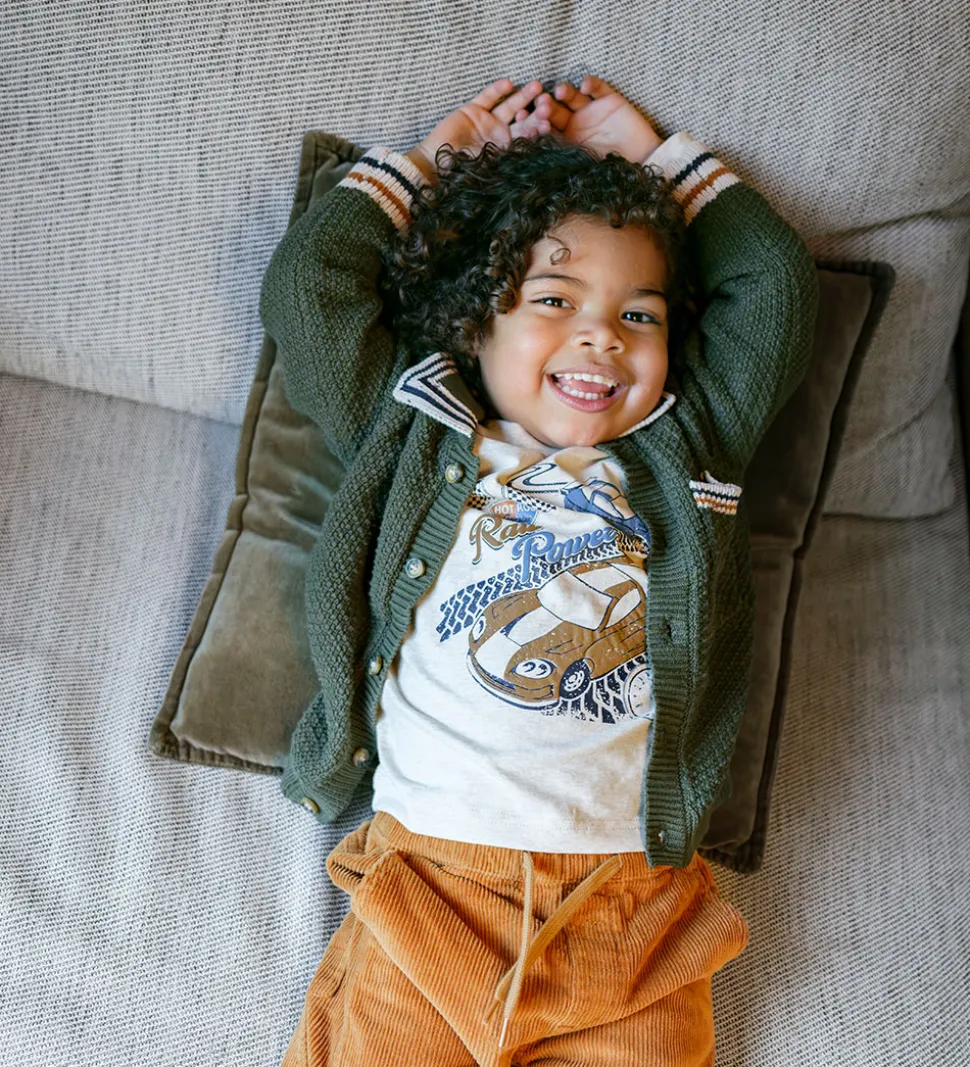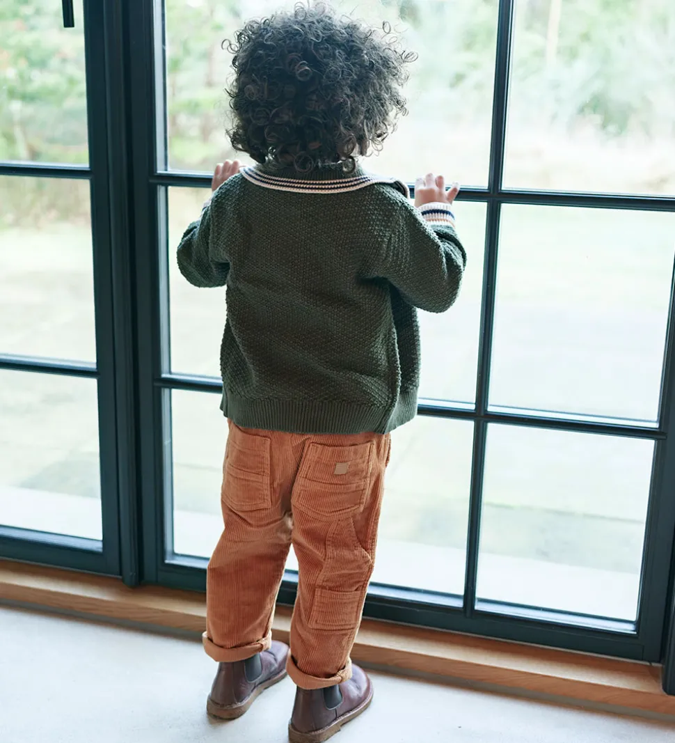 Attraktiv cardigan fra Hust and Claire i en dybgrøn nuance. Cardiganen er lavet i en strikket kvalitet med en flot struktur. Hust and Claire har tilføjet fine detaljer som striber langs kraven, lommeåbningen og manchetterne. Knapperne i trælook tilfører en subtil elegance til cardiganen.