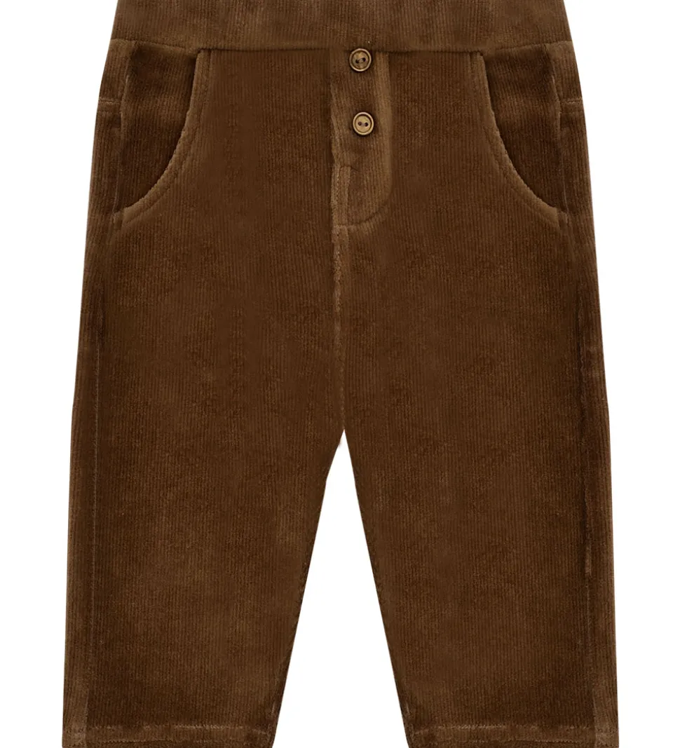 Lækre Hust and Claire fløjlsbukser i ensfarvet brun. Hust and Claire fløjlsbukserne har en justerbar elastikkant i livet for en behagelig pasform. Foran er der to dekorative knapper samt praktiske åbne lommer i siderne.