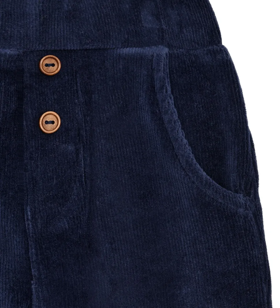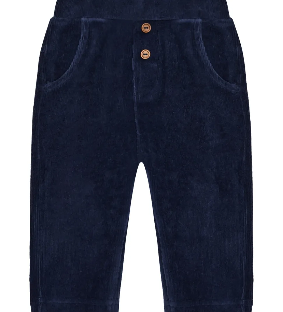 Elegante Hust and Claire fløjlsbukser i en dyb mørkeblå nuance. Hust and Claire fløjlsbukserne har en justerbar elastikkant i livet for en behagelig pasform. Foran er der to dekorative knapper samt praktiske åbne lommer i siderne.