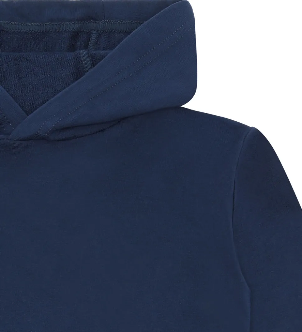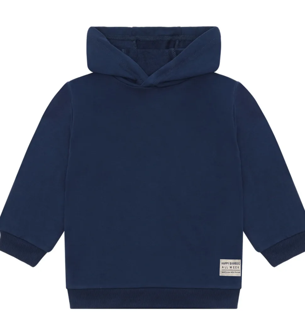 Elegant hættetrøje fra Hust and Claire i en dyb navyblå farve. Hættetrøjen har en blød og behagelig struktur. Den er udstyret med en solid ribkant ved taljen og håndleddene, hvilket sikrer en god pasform. På forsiden findes en lille diskret etiket med teksten “HAPPY BAMBOO ALL WEEK”, som tilføjer en unik detalje til designet.