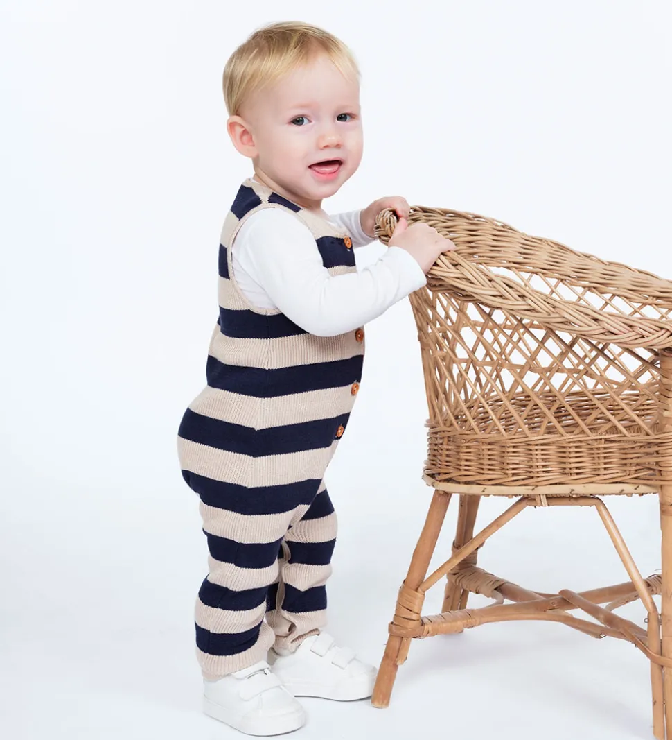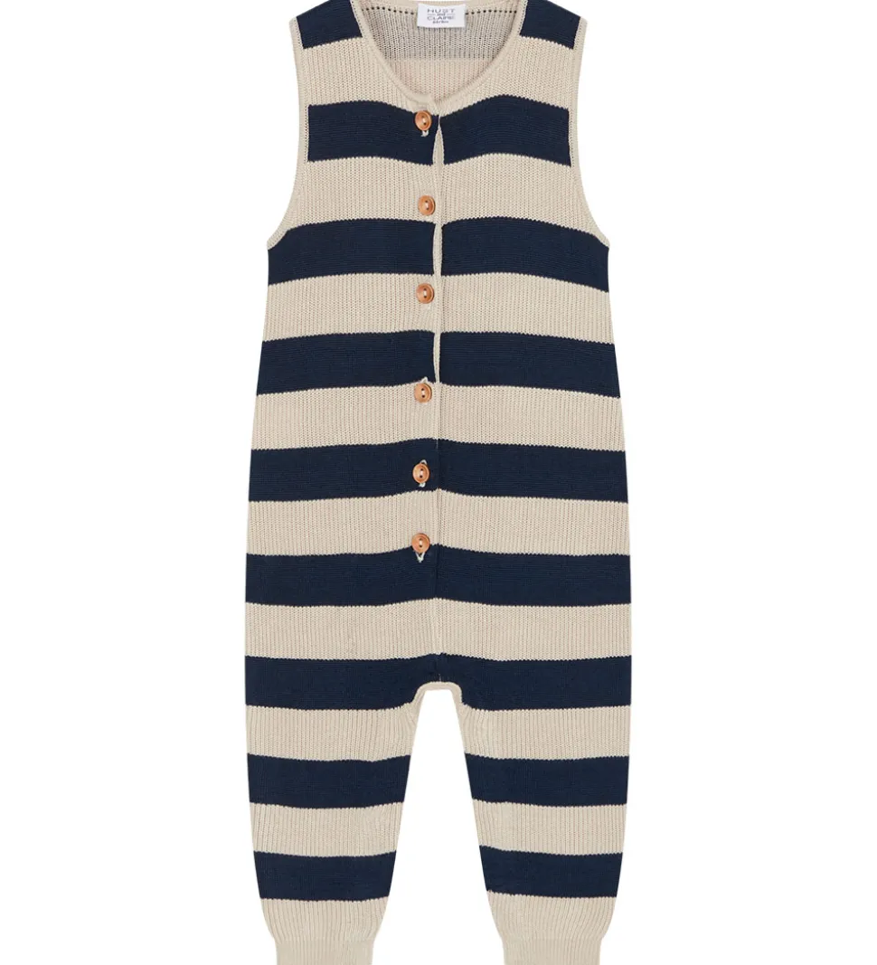Charmerende Hust and Claire heldragt i et stribet mønster med brede, horisontale striber i beige og mørkeblå nuancer.