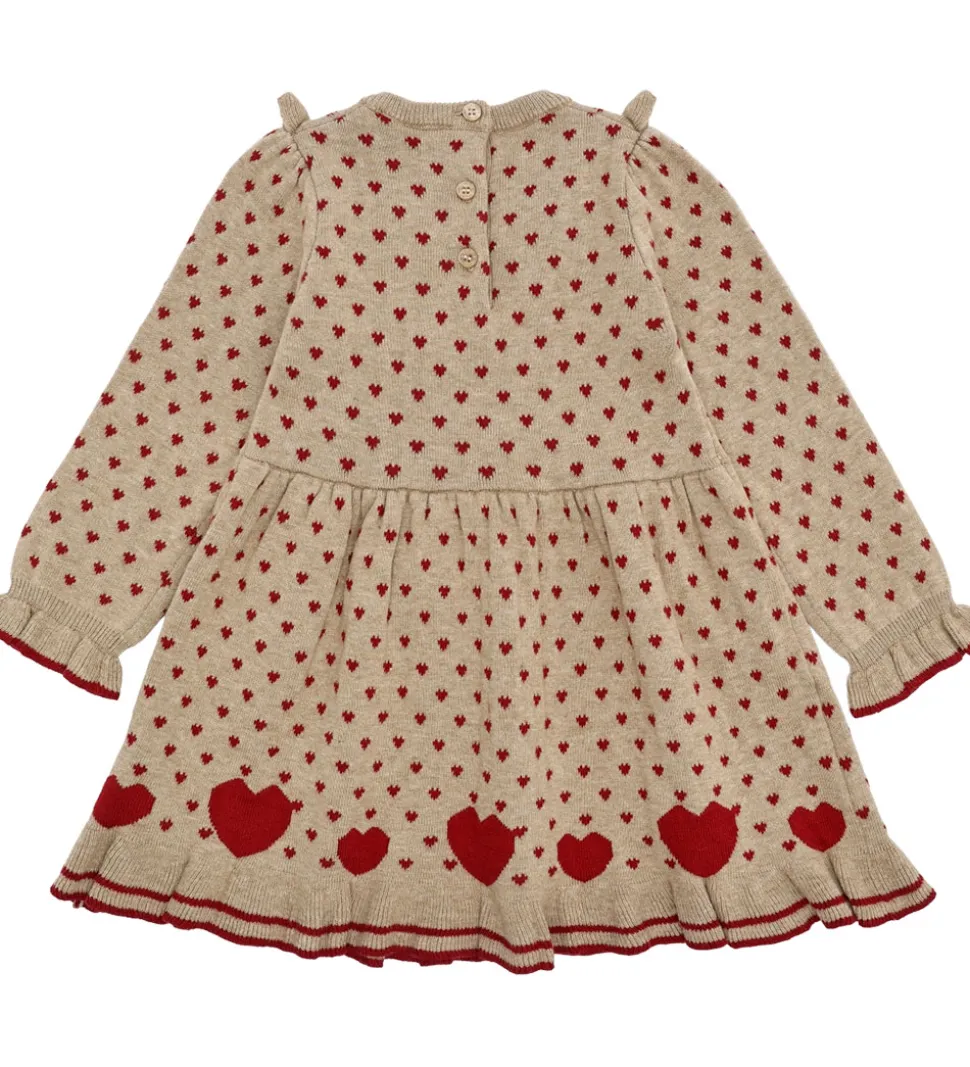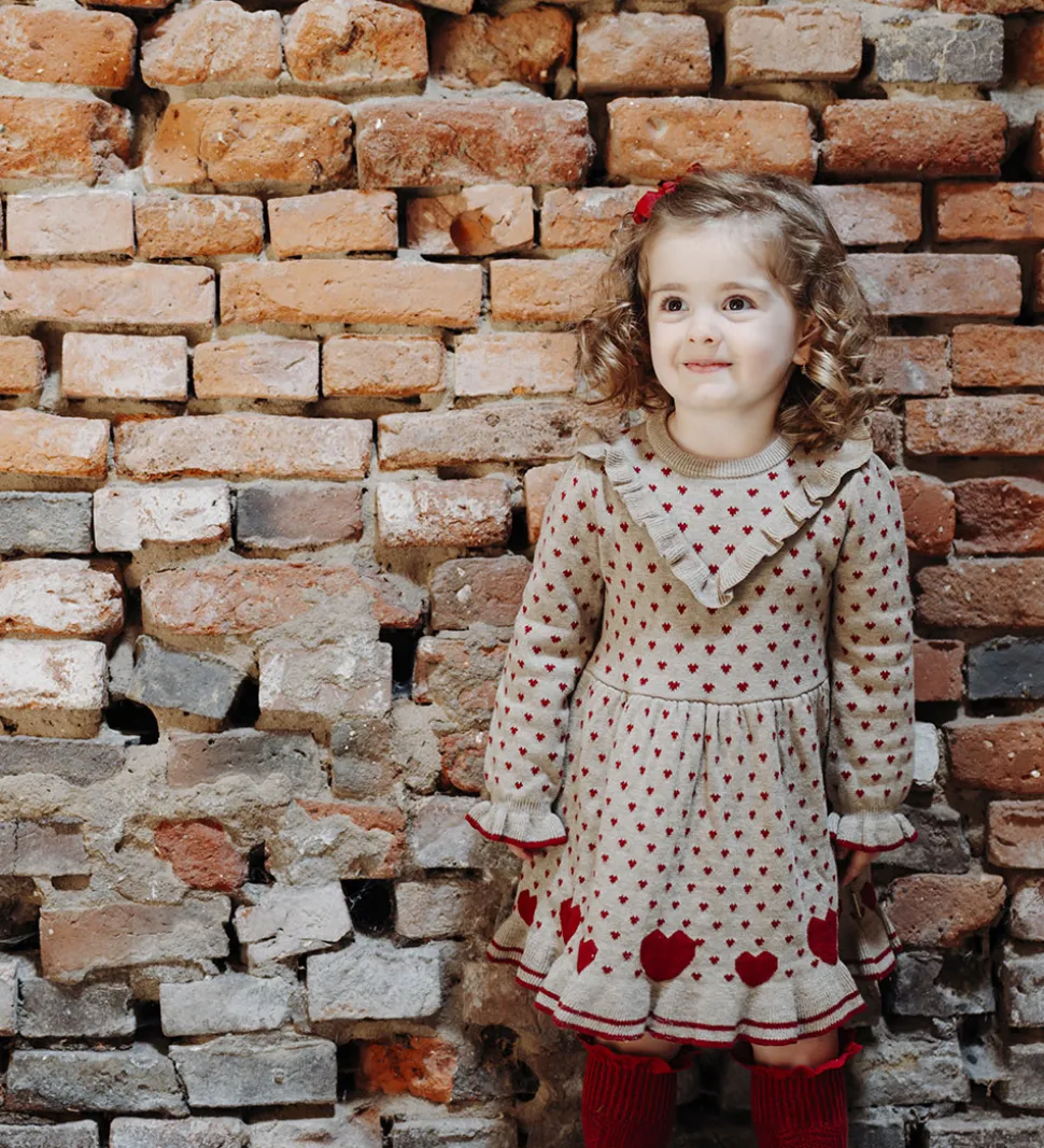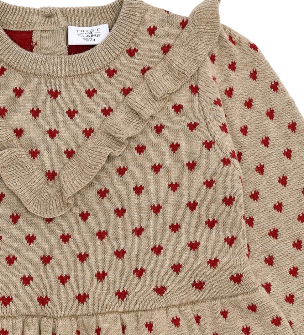 Smuk kjole fra Hust and Claire i en lys beige farve med røde hjerter. Kjolen har lange ærmer og en elegant flæsedetalje ved halsudskæringen. Kjolen er lavet i en strikket kvalitet, og den lukkes i nakken med knapper.