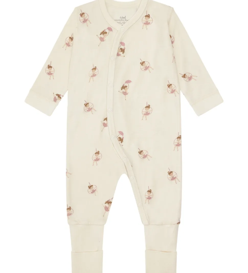 Fin natdragt fra Hust and Claire i råhvid med et alloverprint af ballerinaer i rosa nuancer. Natdragten har med lange ærmer og gennemgående knaplukning fra hagen til venstre fod. Natdragten har lange ben med brede ribkanter og mulighed for ombuk til lukkede fødder. Natdragten er fremstillet i en blød blanding af uld og bambus viskose.