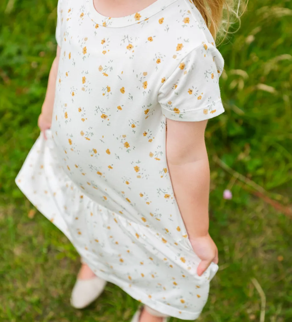 Elegant Hust and Claire natkjole med et blødt design i hvidt dekorativt med små gule blomster over hele stoffet.