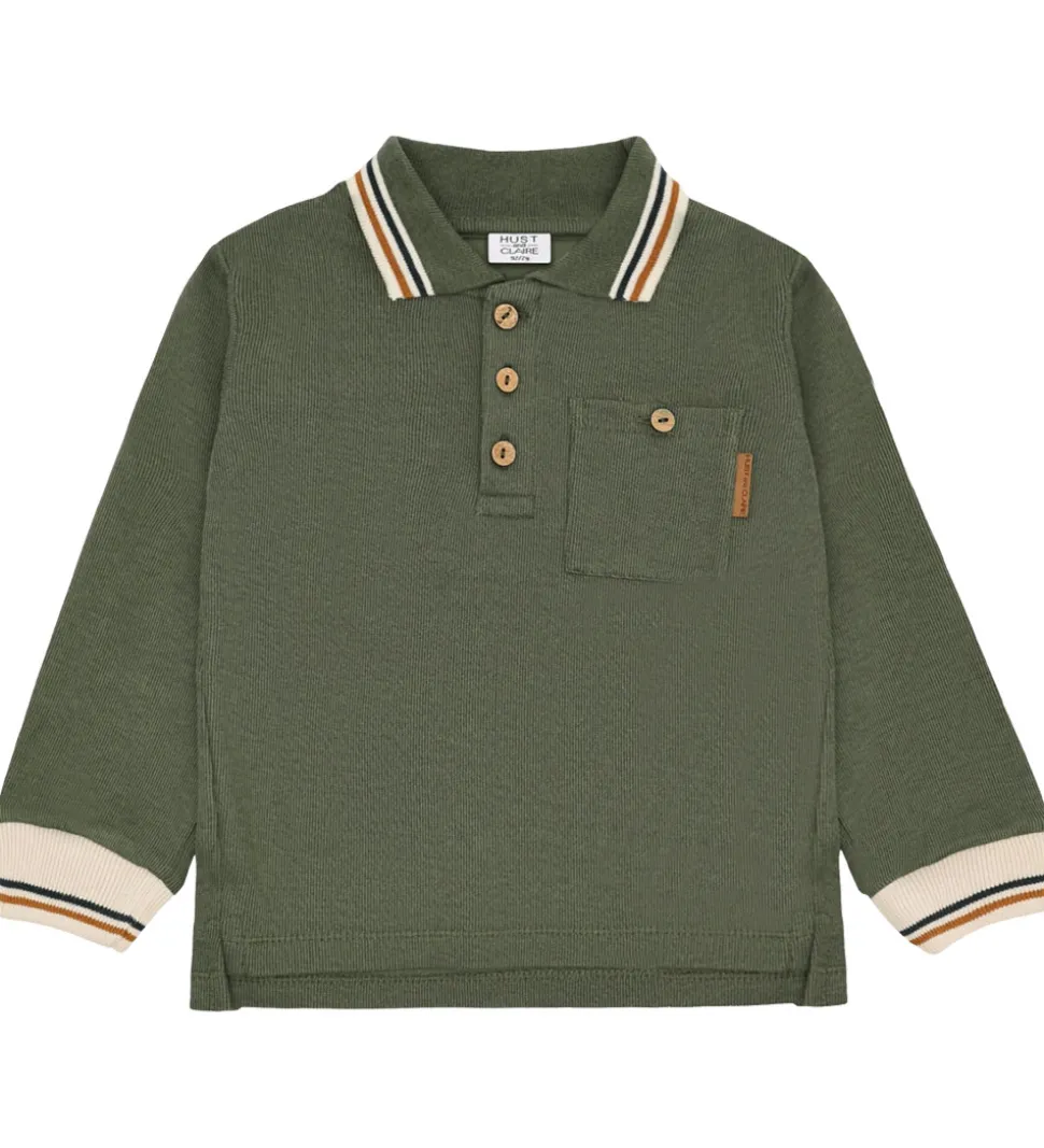 Elegant polobluse fra Hust and Claire med lange ærmer i en dæmpet grøn farve. Poloblusen har en klassisk polokrave med striber i kontrastfarver samt ribkanter ved ærmerne. På fronten ses en praktisk brystlomme samt knapper i en naturlig træfarve. Hust and Claire sikrer et stilrent design.