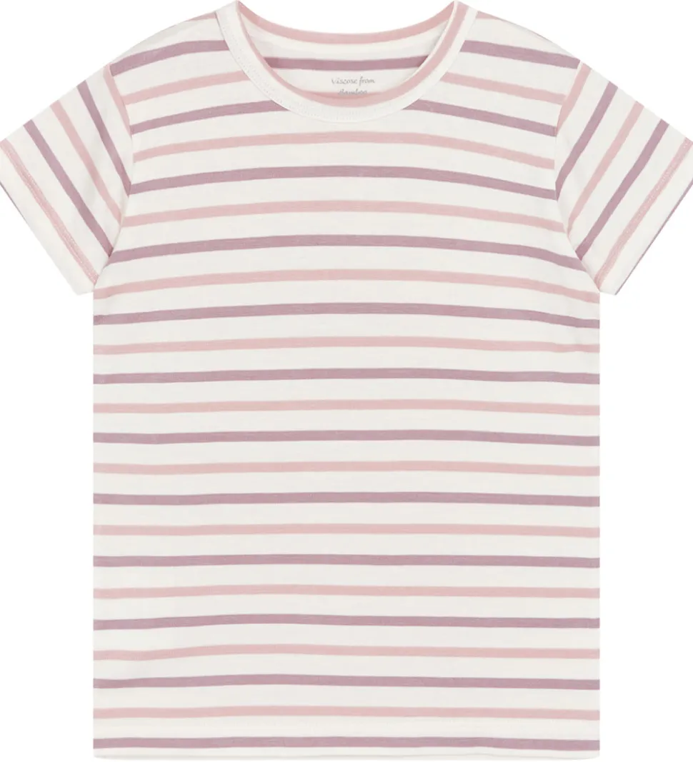 Lækker Hust and Claire t-shirt i en lys beige nuance med striber i rosa og lys lilla. T-shirten har et enkelt design, der gør den tidløs og let at kombinere med øvrige garderobe.