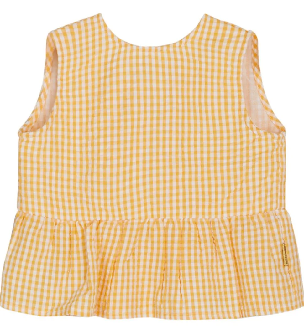 Hust and Claire toppen er uden ærmer og med brede stropper. Bagpå har den slåom effekt som samles med to knapper ved taljen. Toppen har en fin peplumkant forneden og er i en let og fastvævet kvalitet.