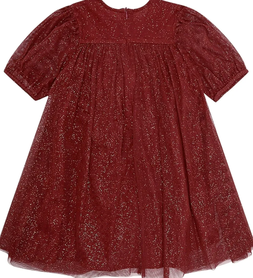 Elegnt Hust and Claire kjole i mørkerødt tyl med guldprikker.