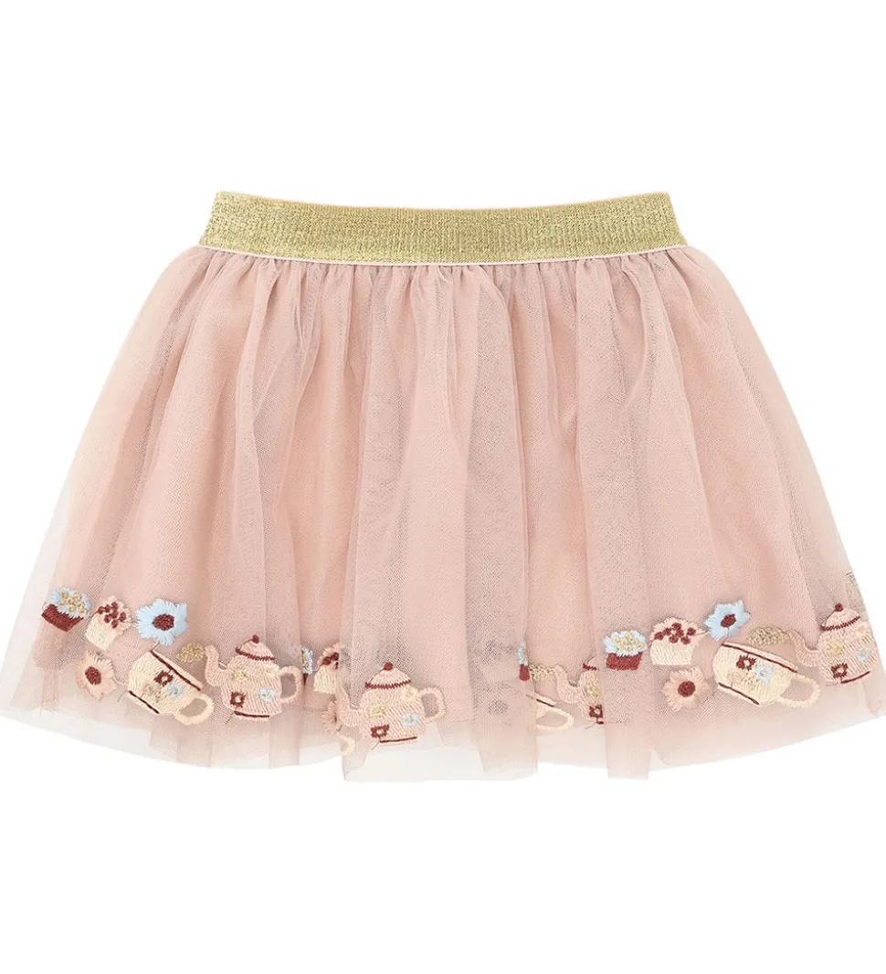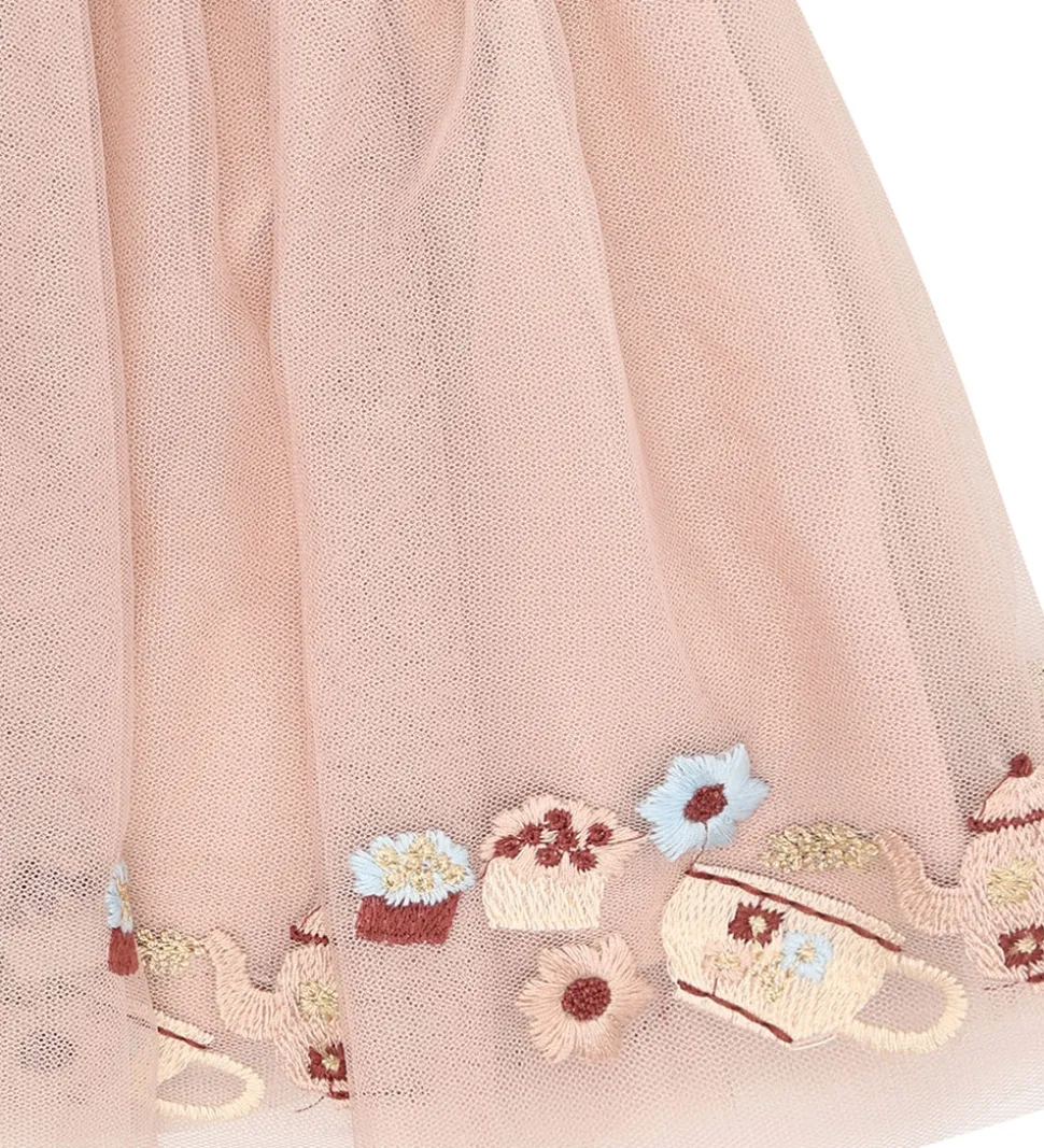 Charmerende Hust and Claire nederdel i sart rosa tyl med broderede detaljer af tekander og blomster langs kanten. Hust and Claire tylnederdelen har en elastisk, gylden talje for en god pasform. På indersiden er der et ekstra lag af blødt bomuldsjersey.