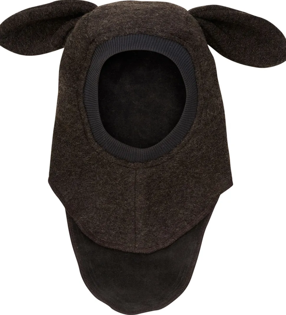 Praktisk Huttelihut elefanthue i en meleret, mørkebrun nuance af lunt uldfleece. Elefanthuen fra Huttelihut består af to lag og har en rund hovedform med lange kaninører. Elefanthuen har ribkant ved ansigtet der sikrer en god pasform.