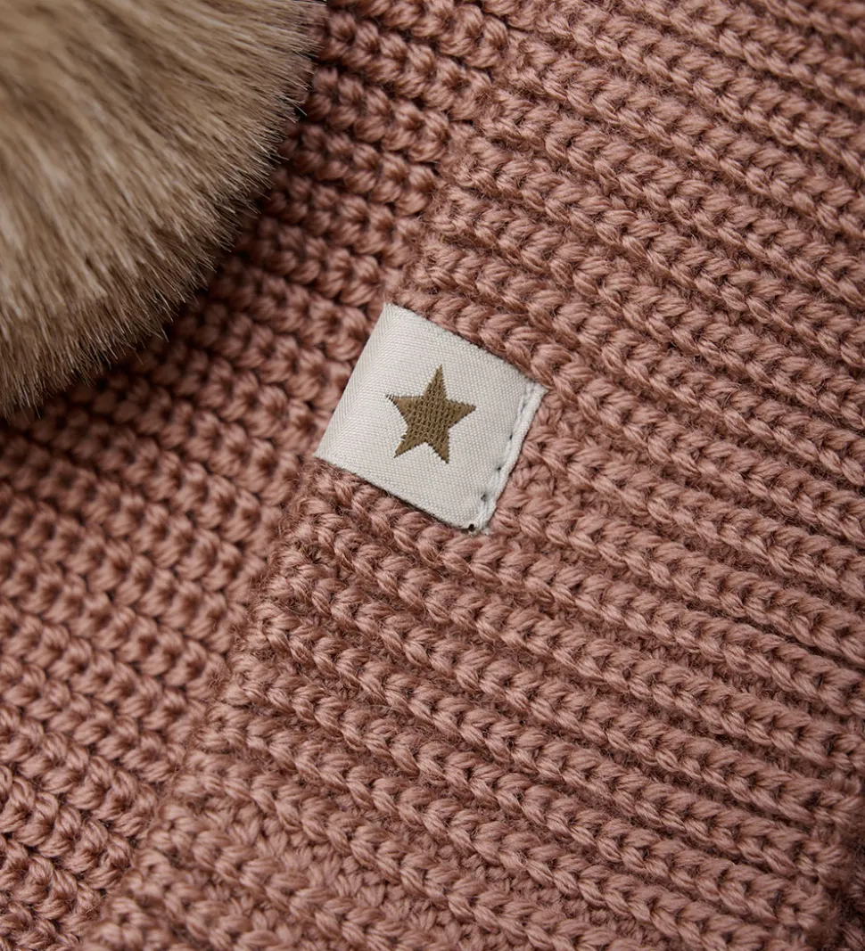 Lækker Huttelihut hue strikket i mørkerosa med to store, bløde kvaster på toppen.