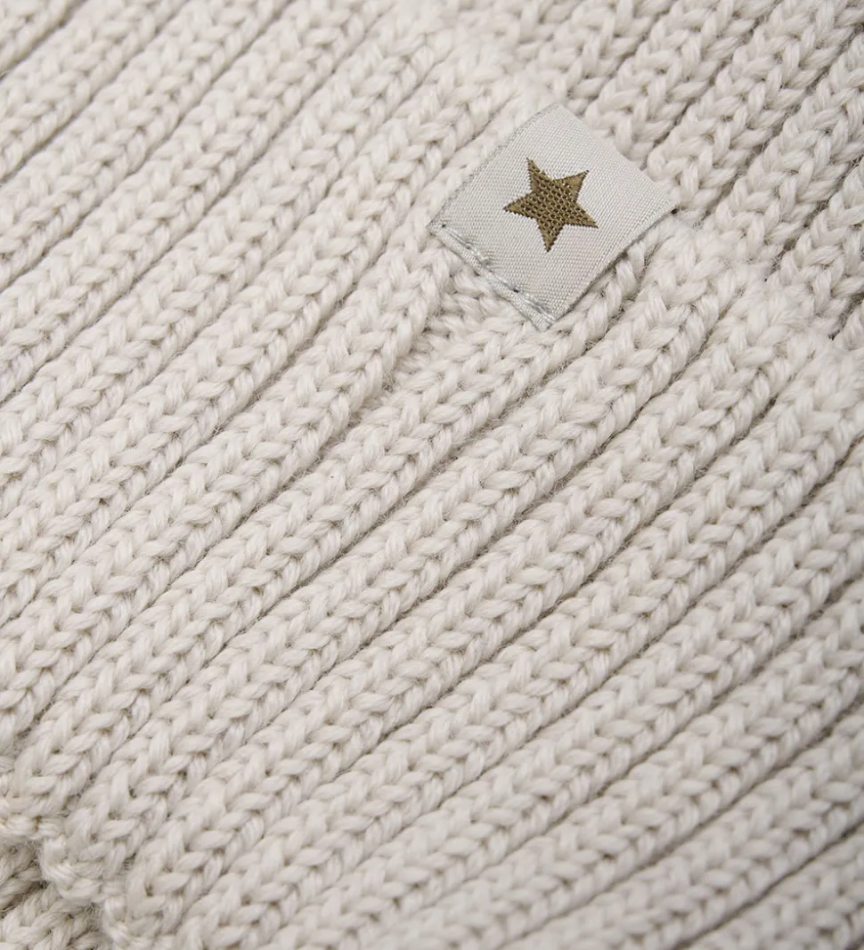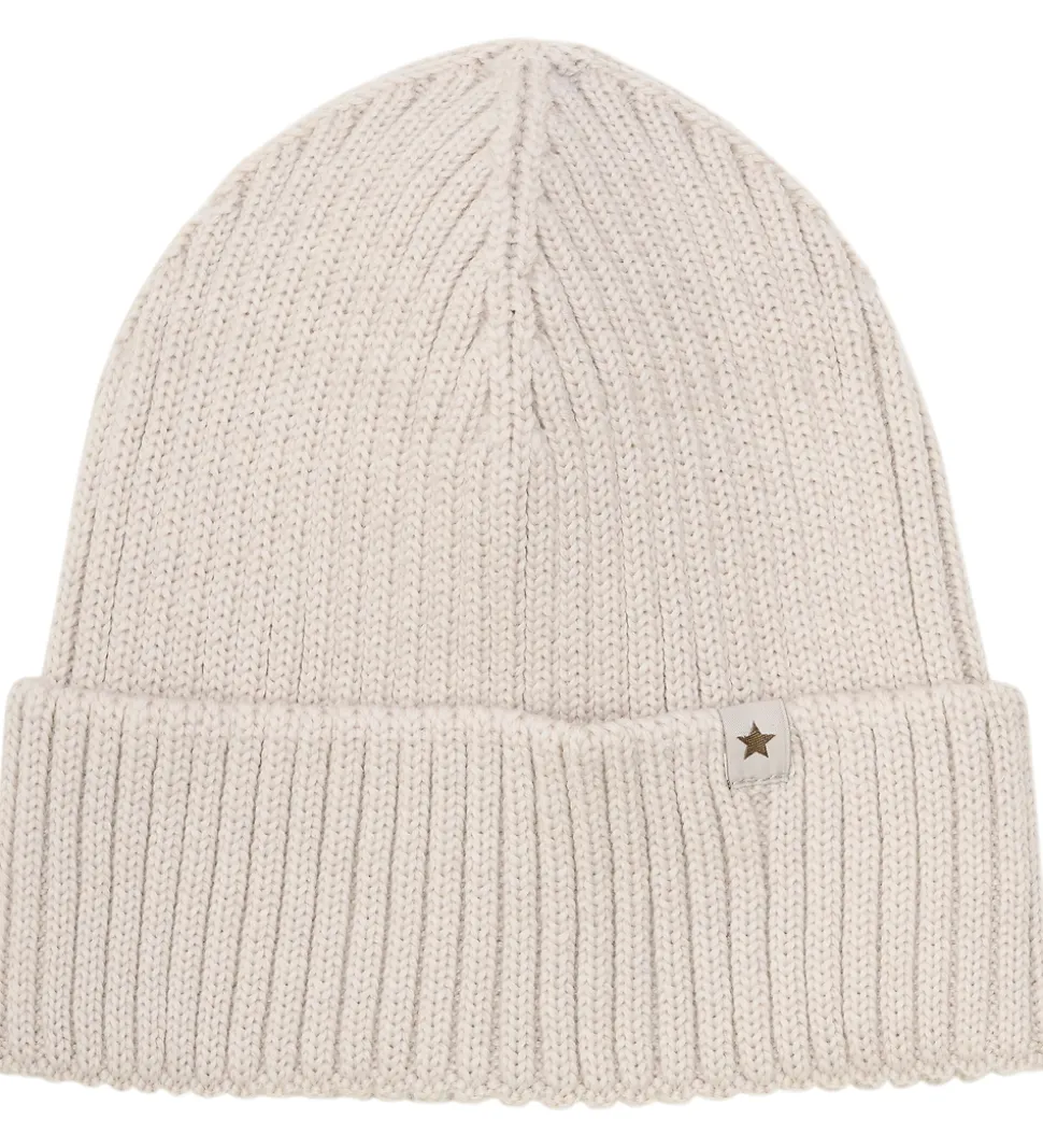 Elegant Huttelihut hue strikket i en lys, beige nuance med en fin ribstruktur. Huen har en bred, foldet kant for et stilrent udtryk. På kanten er der en lille mærkat med en stjerne, hvilket tilføjer en diskret detalje.