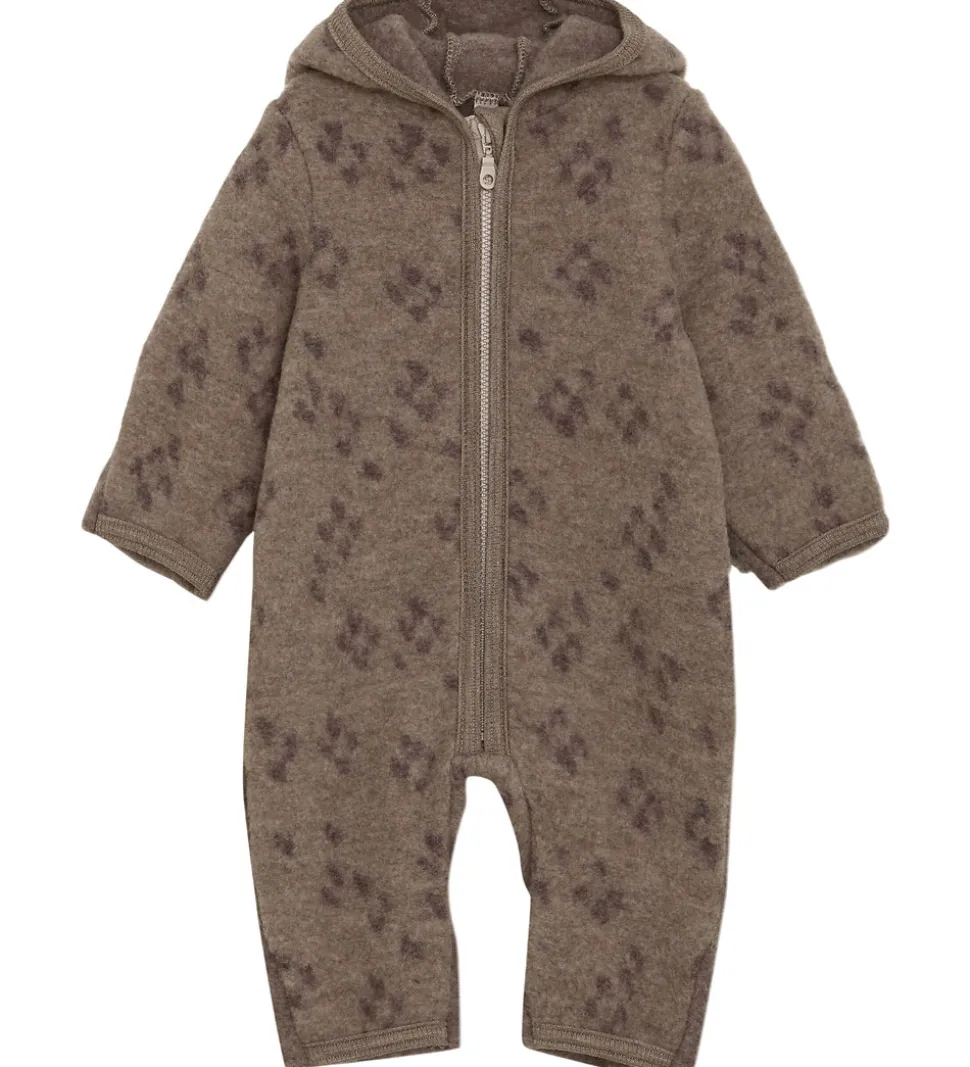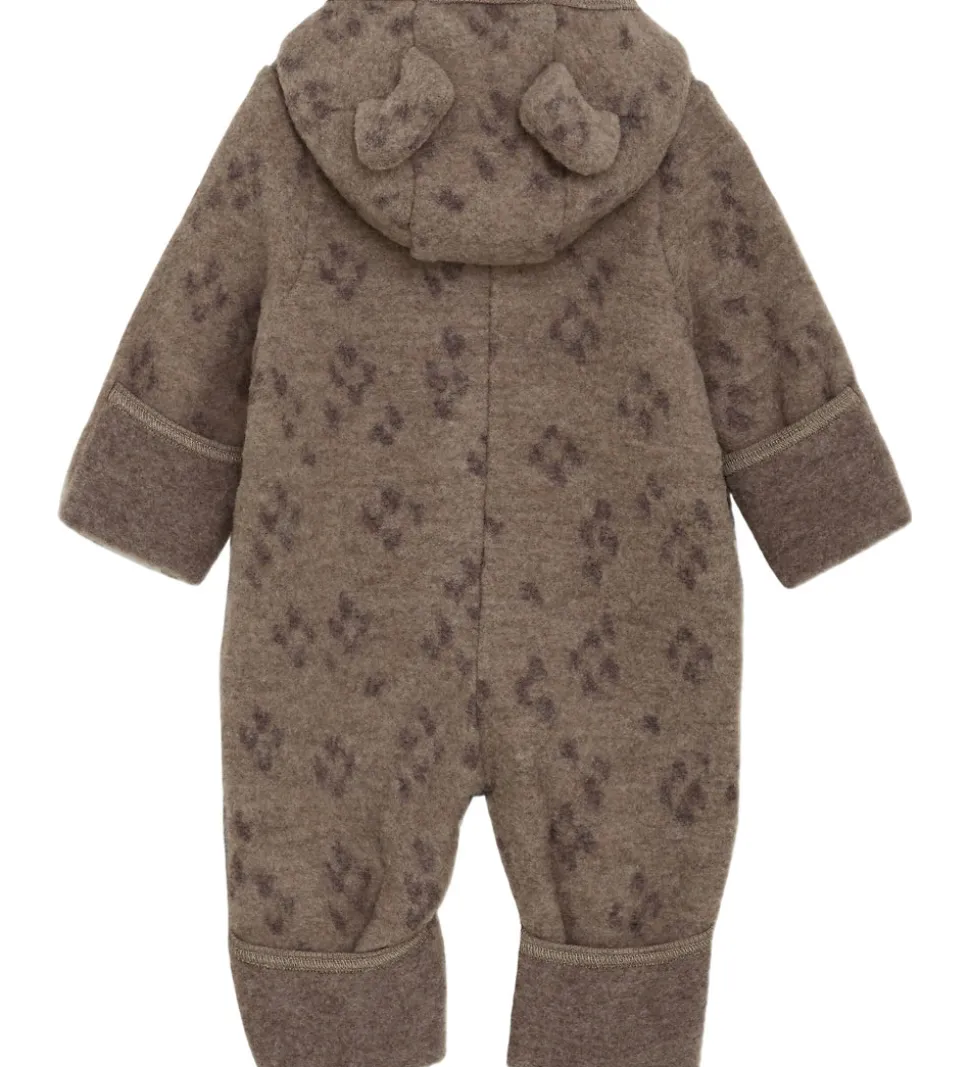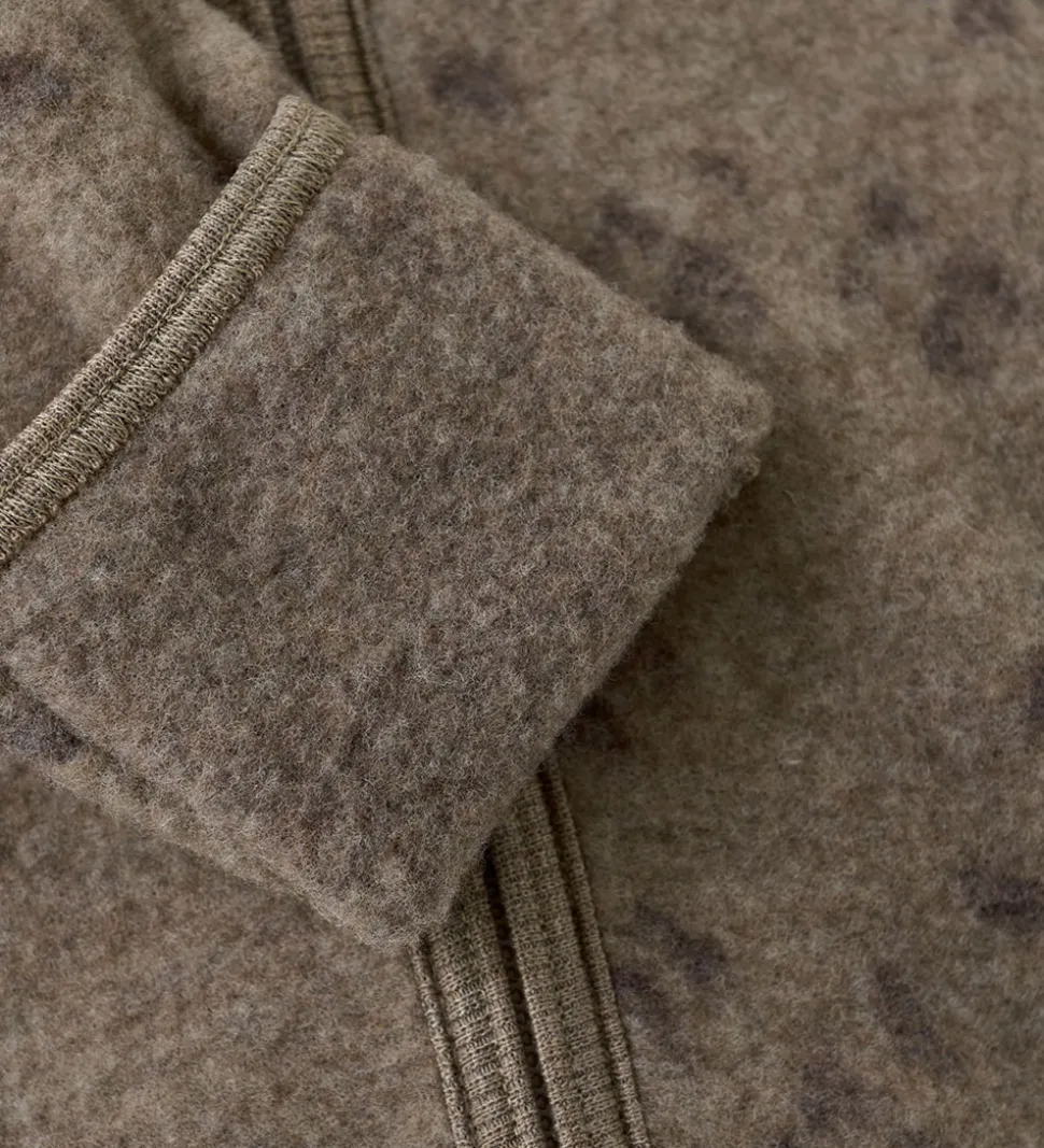 Smuk Huttelihut køredragt i meleret, mørkebrun uldfleece og med grå detaljer.