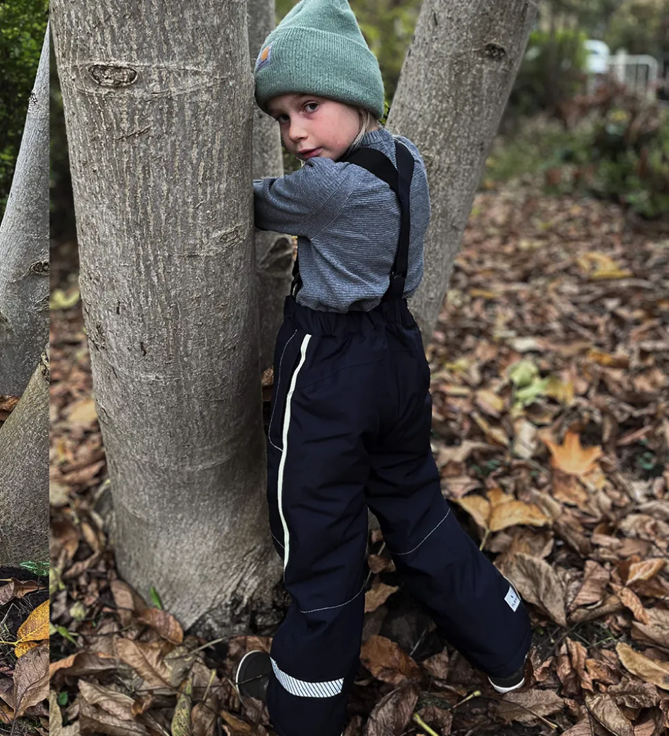 Praktiske ILDHU skibukser i navyblå med mange reflekser for høj synlighed i trafikken.