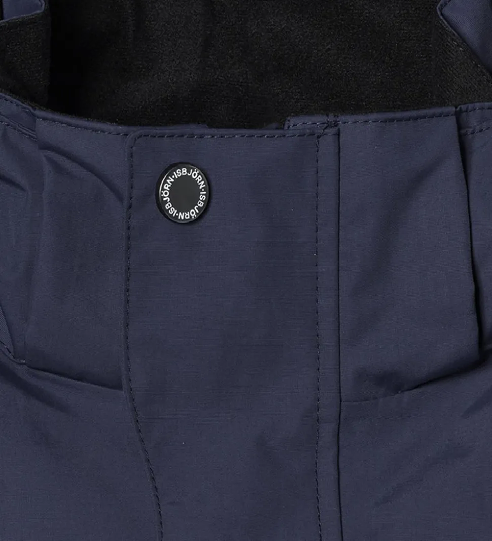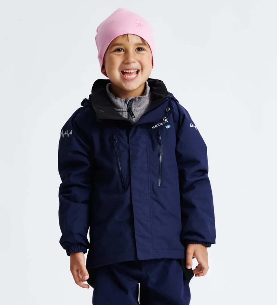 Isbjörn Of Sweden skaljakken åbnes fortil ved hjælp af en lynlås med hagebeskytter og dobbelt vindstolpe, hvoraf den udvendige lukkes til med velcro og en trykknap i toppen. Hagebeskytteren og den indvendige vindstolpe er fleeceforede.