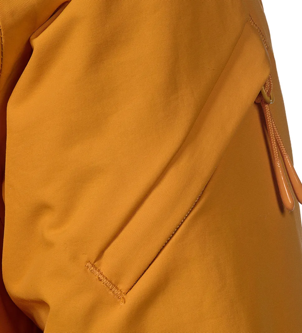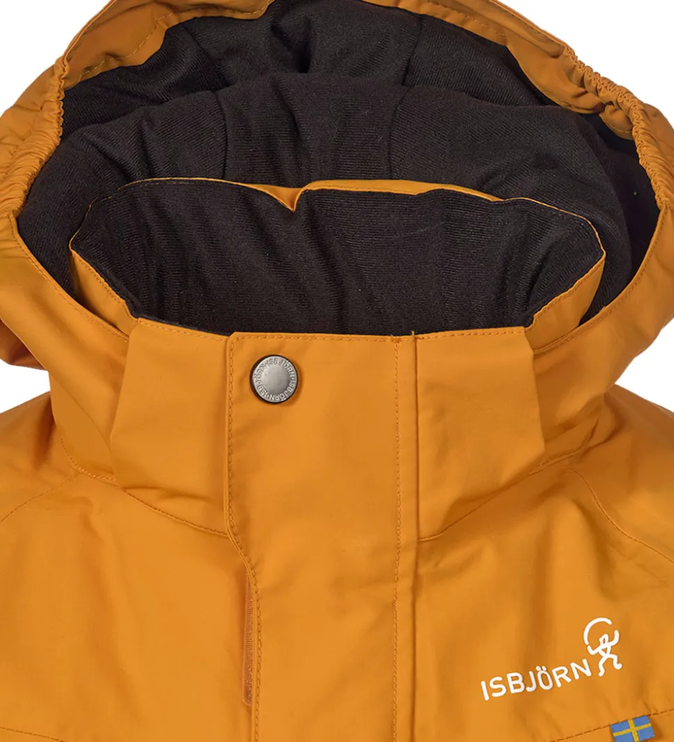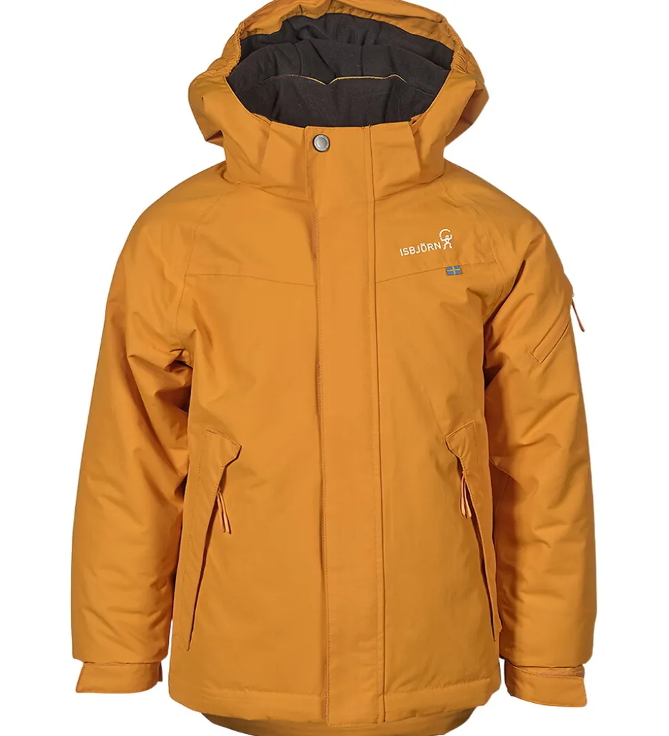 Flot Isbjörn Of Sweden vinterjakke i en orange nuance. Vinterjakken har hvide logoprint på venstre bryst og hætten samt smarte refleksprint på lænden og højre skulder.