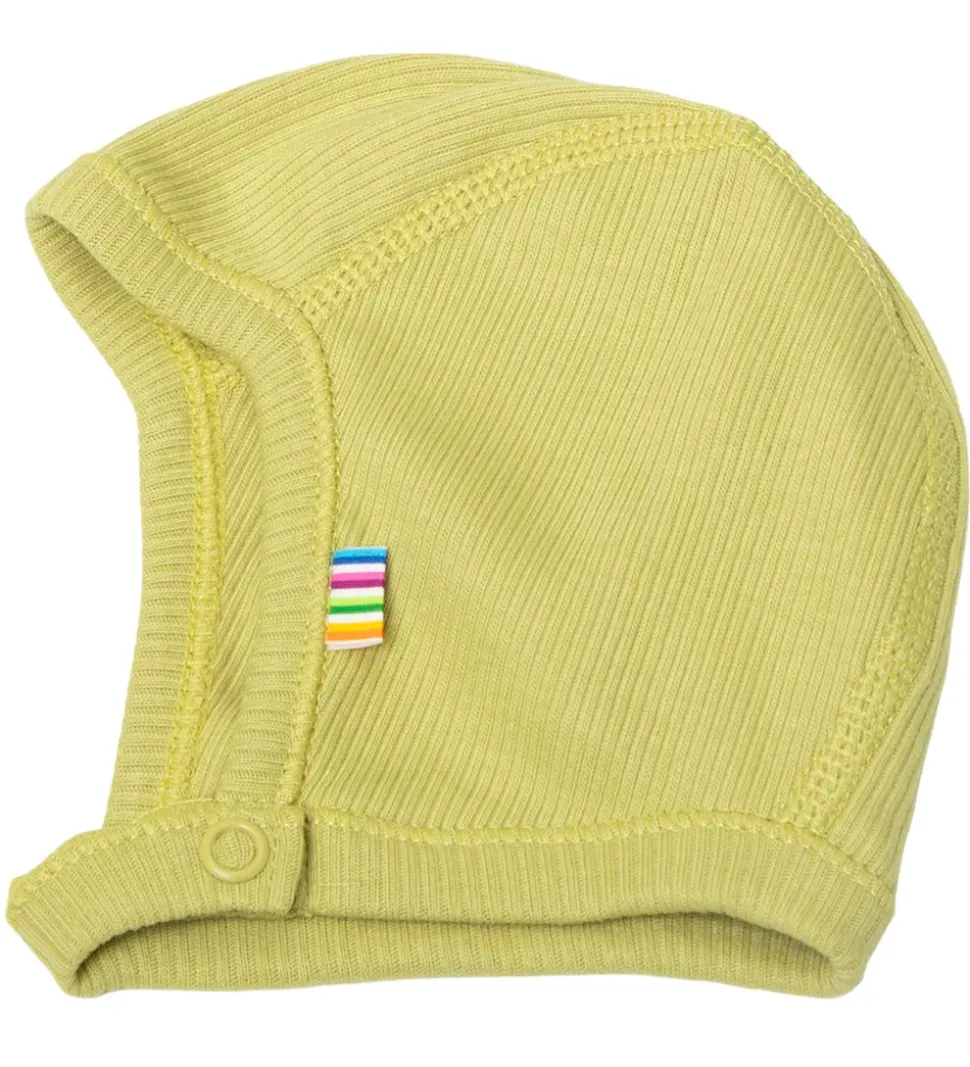 Sød Joha babyhjelm i en lys, støvet grøn nuance med en flot ribstruktur.