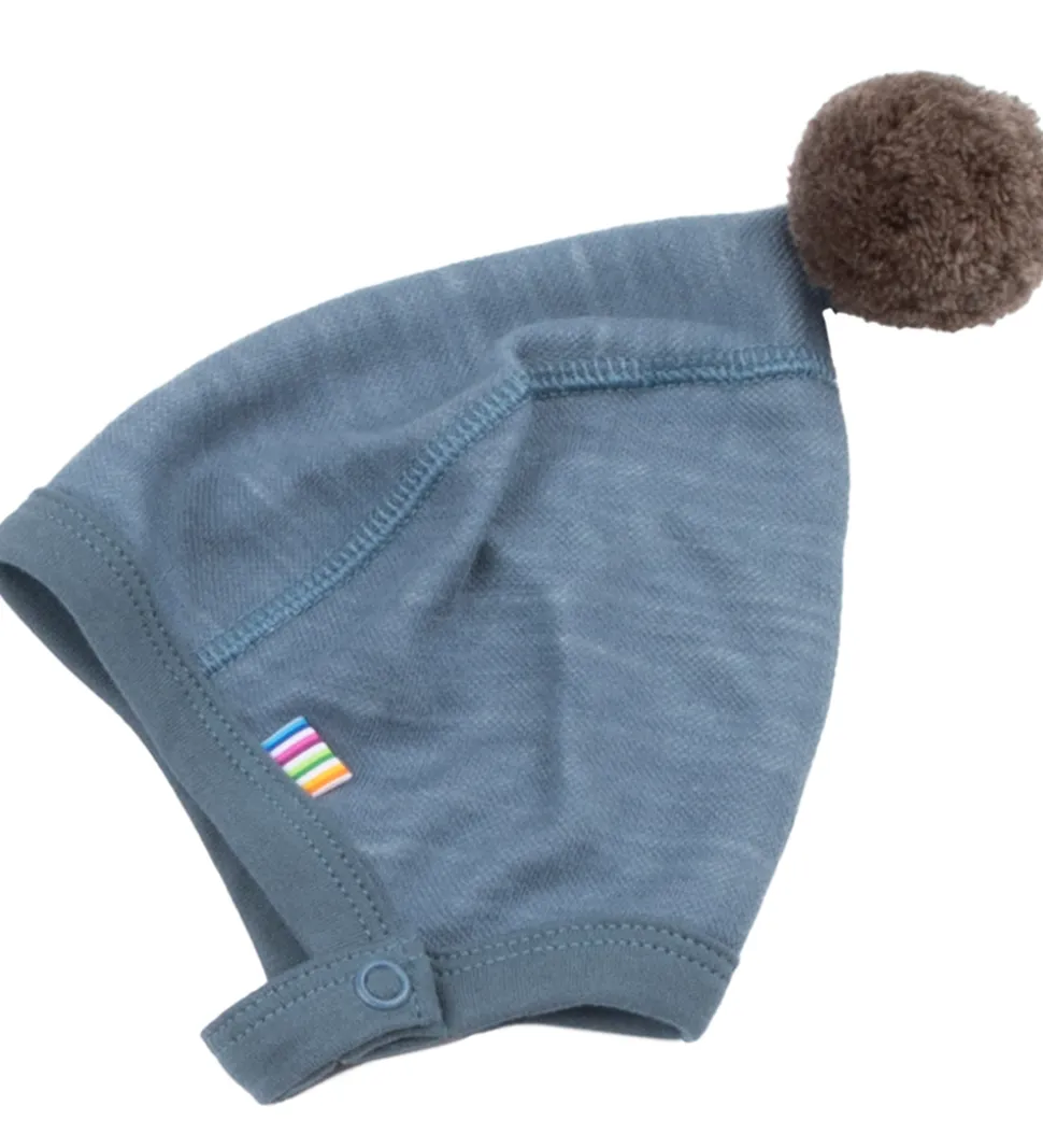 Flot Joha babyhjelm i en meleret blå farve med en sjov brun kvast på toppen.