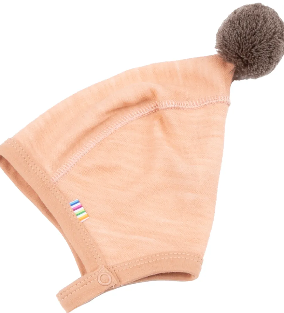 Flot Joha babyhjelm i en meleret fersken farve med en brun pompon på toppen.