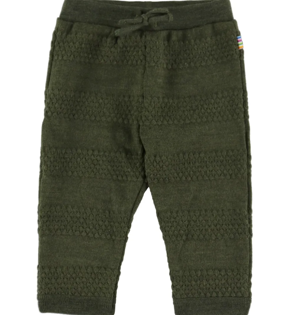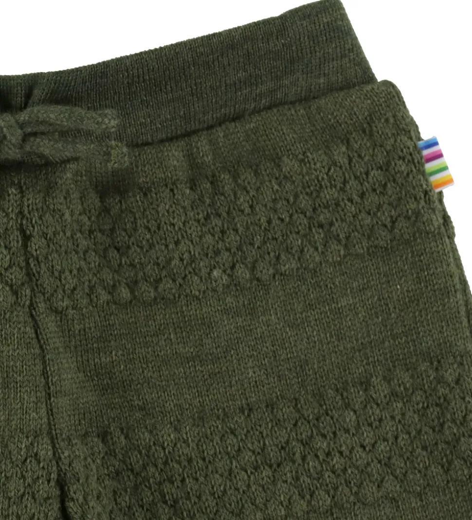 Skønne Joha bukser i mørkegrøn strik med stribet struktur. Bukserne har en komfortabel pasform med elastik i taljen og dekorative snører foran. I benåbningerne er der smalle kanter. Bukserne er fremstillet af merinould.
