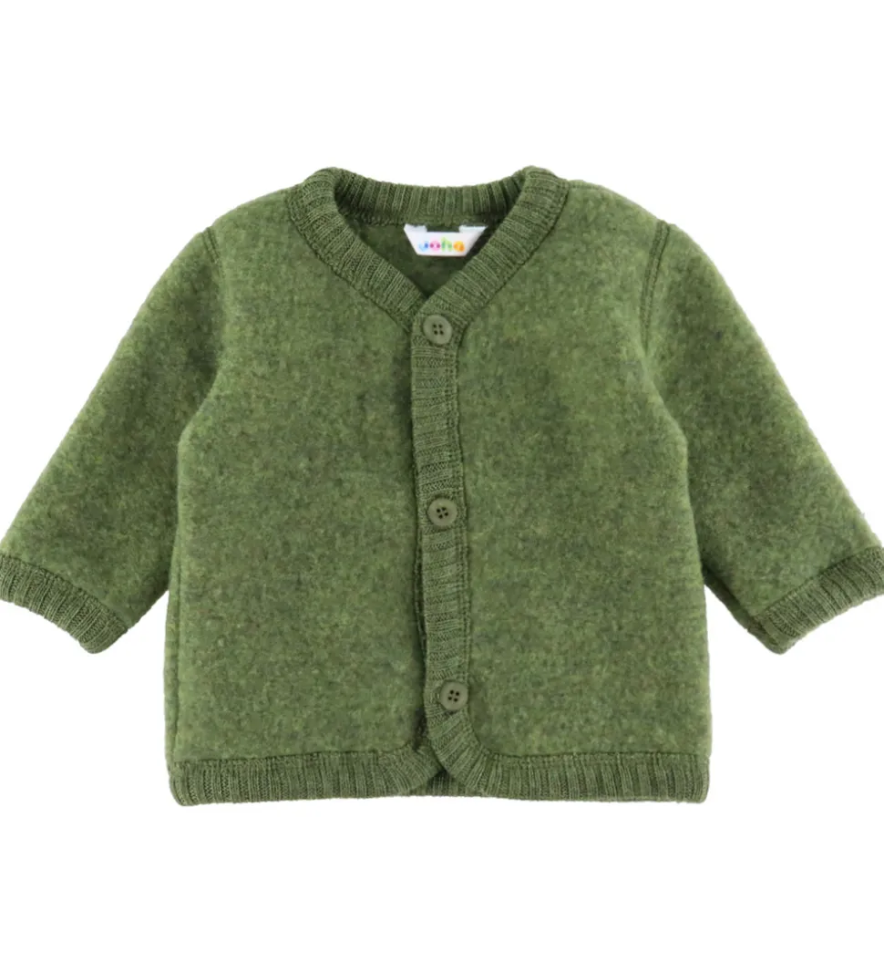 Joha cardiganen er fremstillet af en kraftig, filtet merinouldskvalitet, der kan holde barnet dejlig varm på de kølige dage.