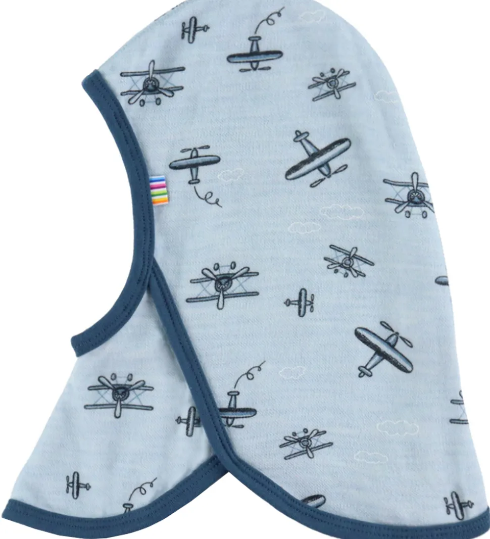 Elegant Joha elefanthue i lyseblå med et fint print af flyvemaskiner og små skyer. Joha elefanthuen har en rund hovedform og er detaljeret med en enkel kant. Elefanthuen har en praktisk split-effekt i bunden, hvilket giver et godt fit omkring halsen.
