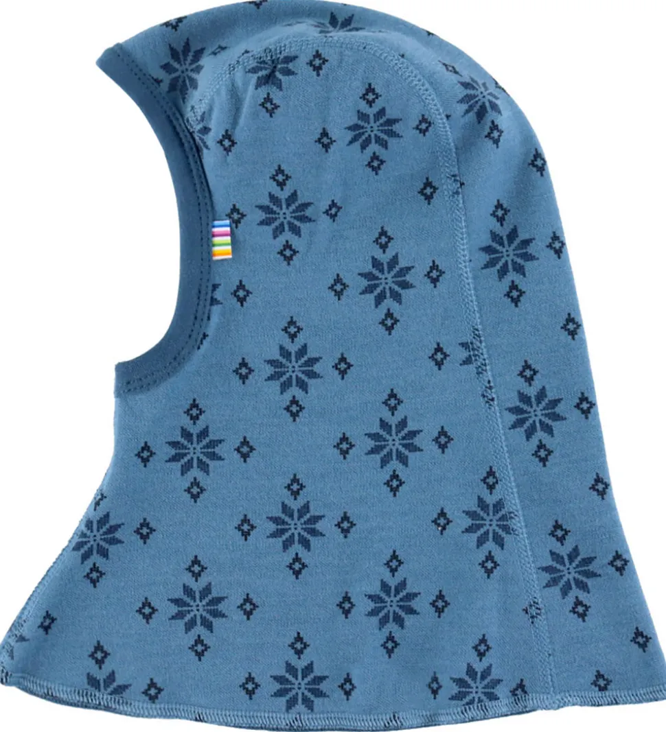 Fin Joha elefanthue i blå med snefnugmønster. Joha elefanthuen består af to lag og har en rund hovedform. Den er dekoreret med et diskret logomærke i regnbuefarver på siden.