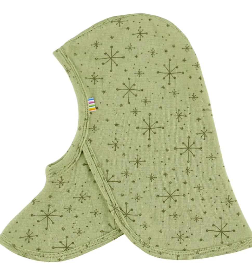 Elegant Joha elefanthue i olivengrøn med stjerneprint. Joha elefanthuen består af to lag og har en rund hovedform. Designet sikrer en tæt pasform omkring ansigtet.