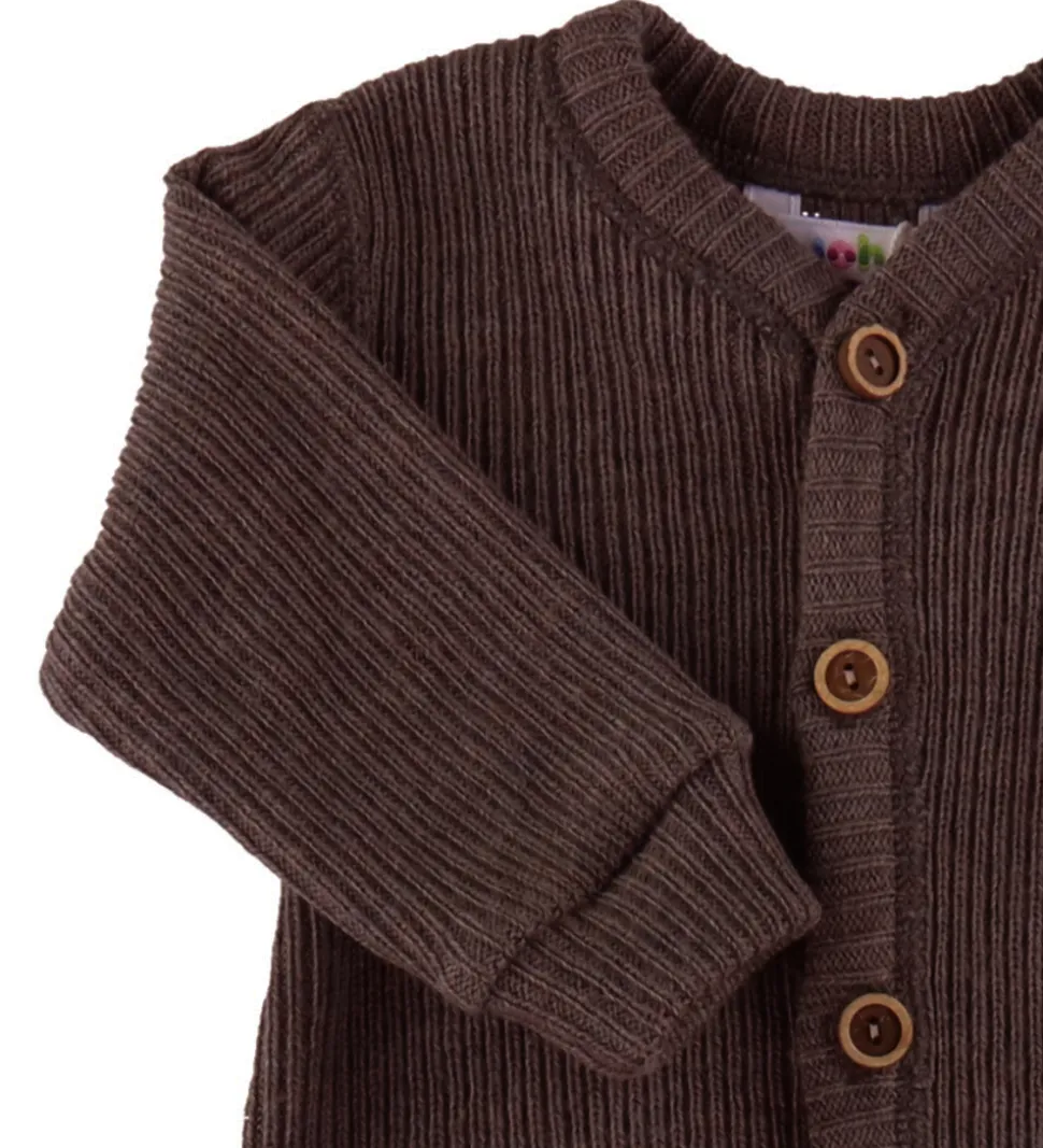 Skøn Joha heldragt i en dyb mørkebrun farve og med ribstrikket struktur. Heldragten har lange ærmer og en praktisk pasform, der giver fri bevægelighed og komfort til de små.