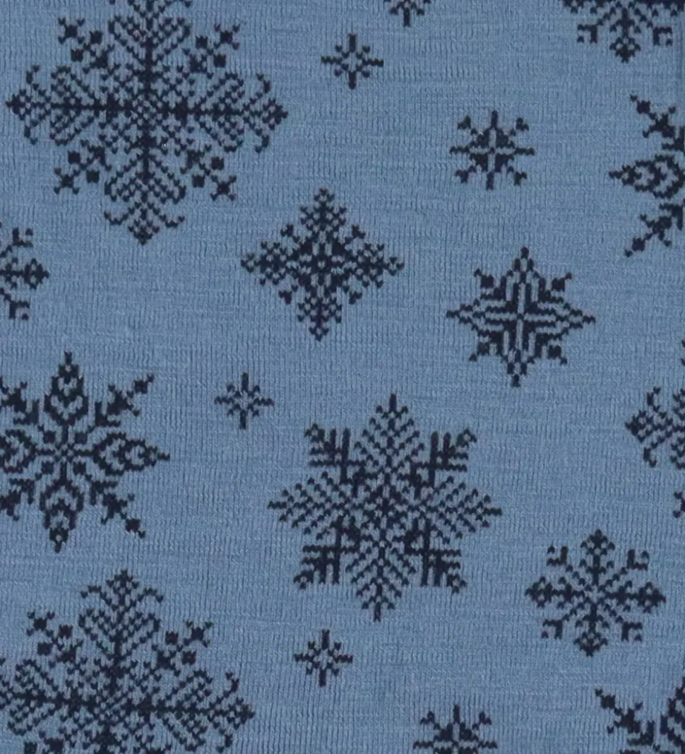Lækker Joha heldragt i blå med fine sorte snefnug i forskellige former og størrelser.