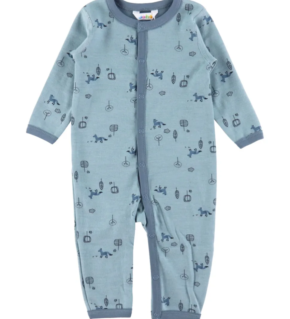 Skøn Joha heldragt i mint turkis, med støvet blå kanter og print af ræve og træer i støvet blå og sorte nuancer.