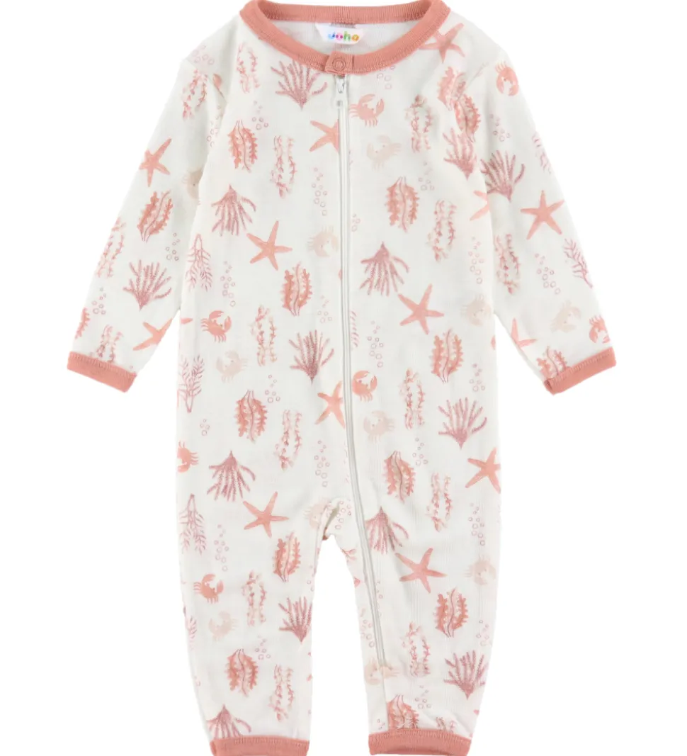 Lækker Joha heldragt i hvid med et sødt havmotiv bestående af krabber, søstjerner og tang i rosa nuancer.