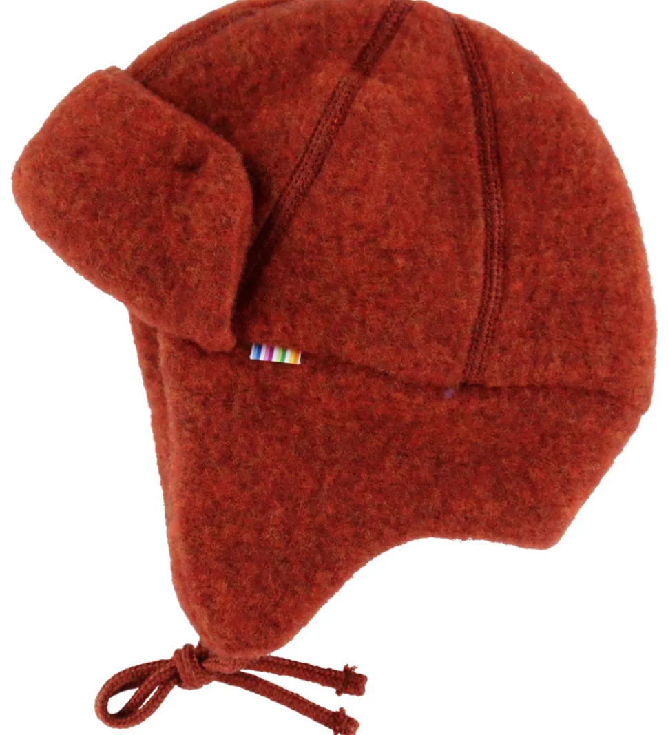 Behagelig Joha hue i en varm, rustrød nuance. Joha huen har en rund hovedform og er udstyret med øreklapper og praktiske bindebånd, der sikrer en god pasform. I toppen af ansigtsåbningen er der en fast ombukket skygge.