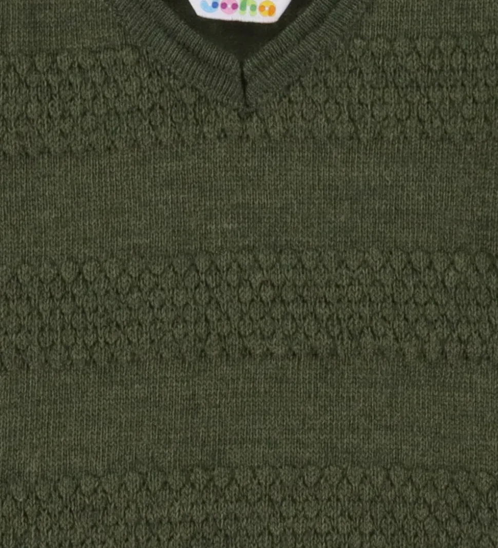 Elegant Joha kjole i mørkegrøn strik med stribet struktur. Kjolen har en enkel v-udskæring og lange ærmer. Den er lavet i blødt merinould.