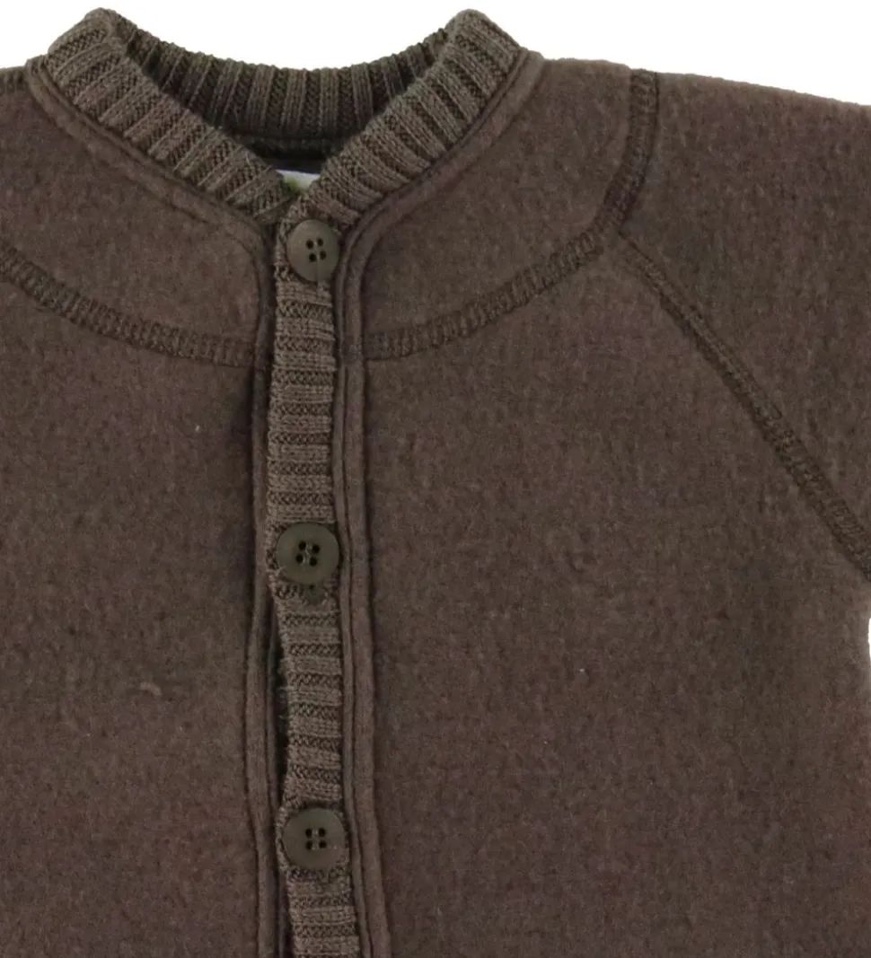 Joha køredragten har lange ærmer og ben, og i alle åbninger er der smalle ribkanter. Fortil kan dragten åbnes med praktiske knapper. Køredragten er lavet af en kraftig, filtet uldkvalitet, der føles rigtig blød og behagelig mod huden. Ulden sørger for, at barnet altid har den helt rigtige temperatur.