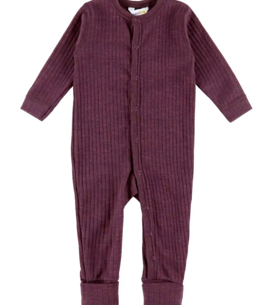 Elegant Joha natdragt med lange ærmer i en dyb, lilla farve. Natdragten har et fint ribmønster og lukkes nemt med trykknapper langs fronten. Ribkanterne ved ærmer og ben giver en pæn afslutning.