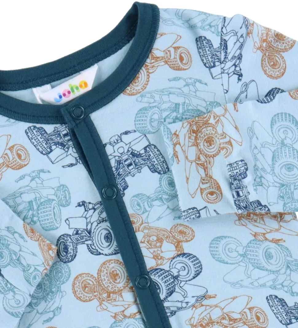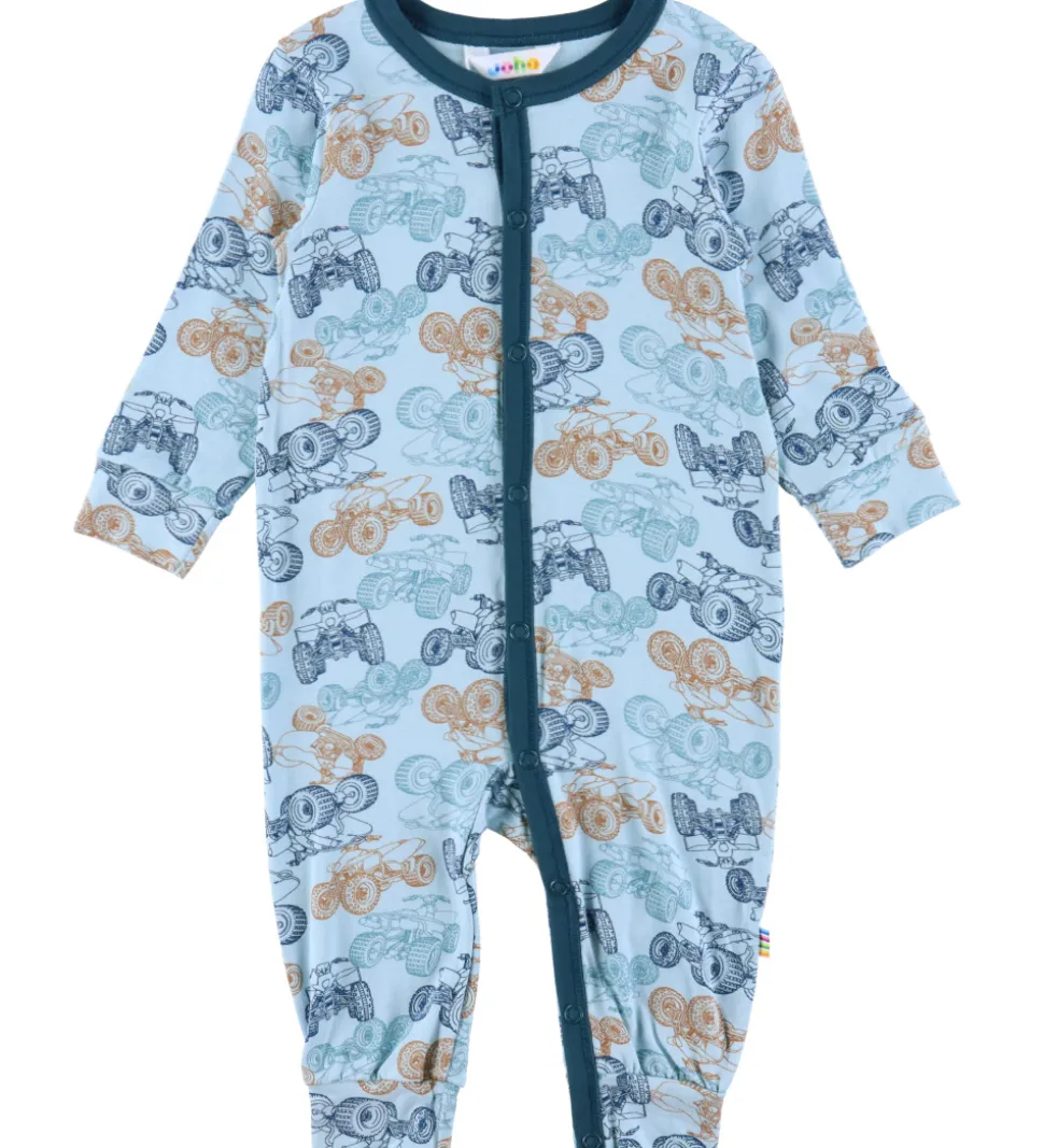 Lækker Joha natdragt i lyseblå med et alloverprint af ATV’er i forskellige farver. Joha natdragten har en rund halsudskæring, lange ærmer og lange ben. Natdragten lukkes med trykknapper fra halsen til venstre fod, så det er muligt at åbne natdragten helt op.