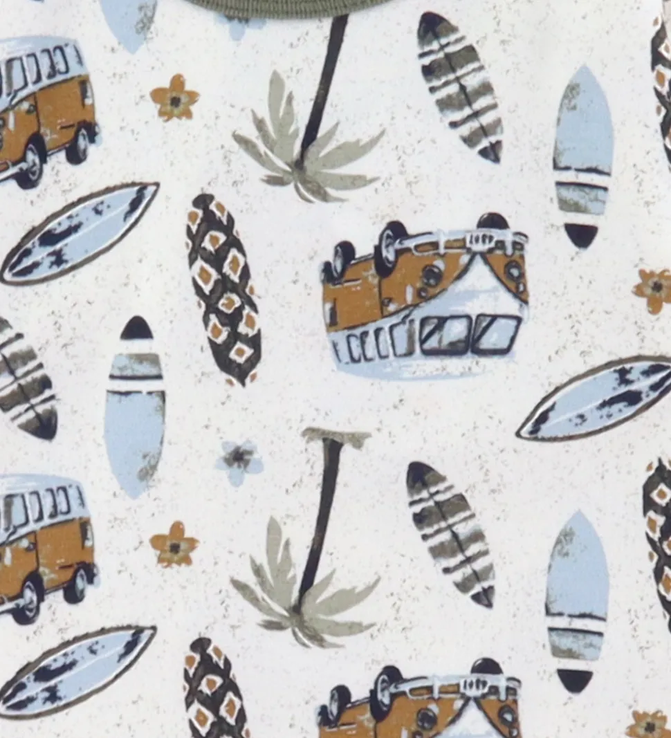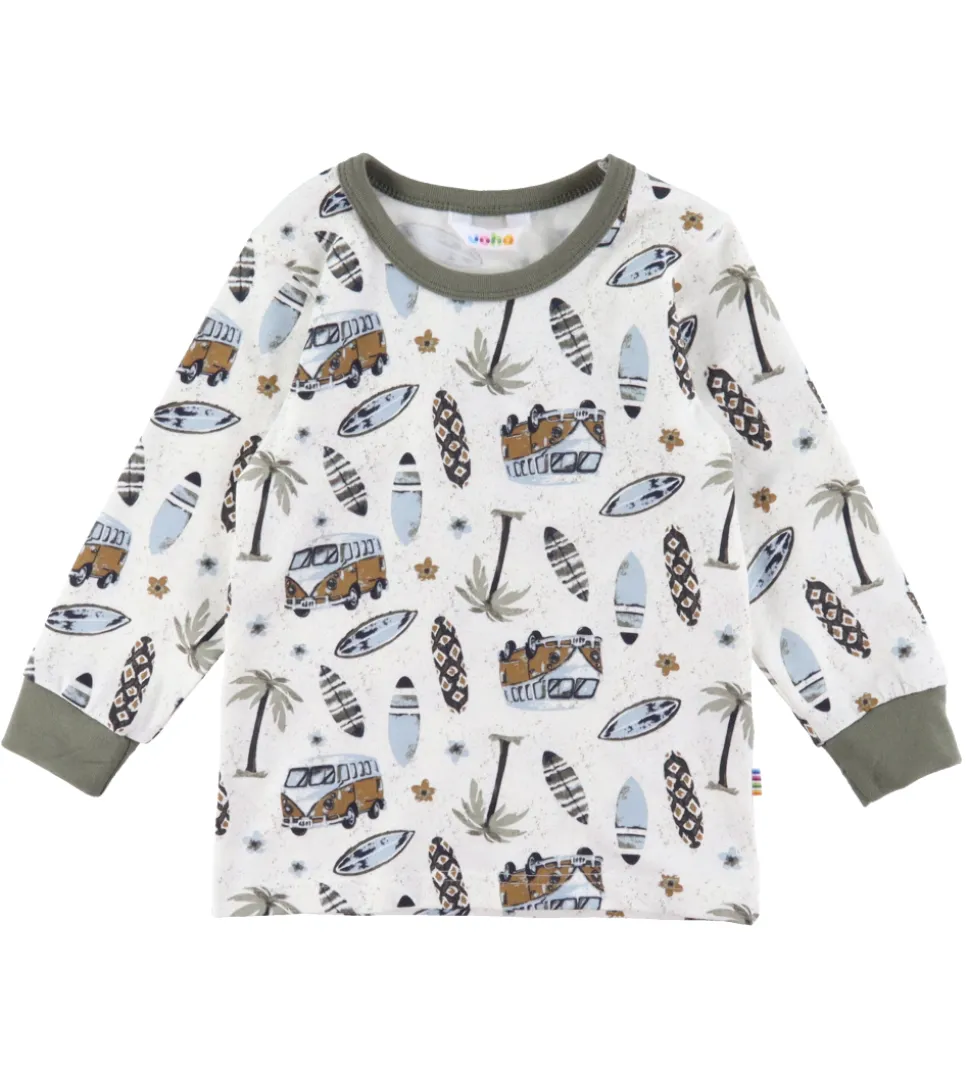 Attraktiv Joha nattøj bestående af en nattrøje og et par natbukser. Nattrøjen er i off white med surf-, folkevognsrugbrød og palmeprint. Natbukserne er i en matchende olivengrøn nuance, hvilket giver et stilfuldt og komfortabelt look til nattens hvile.