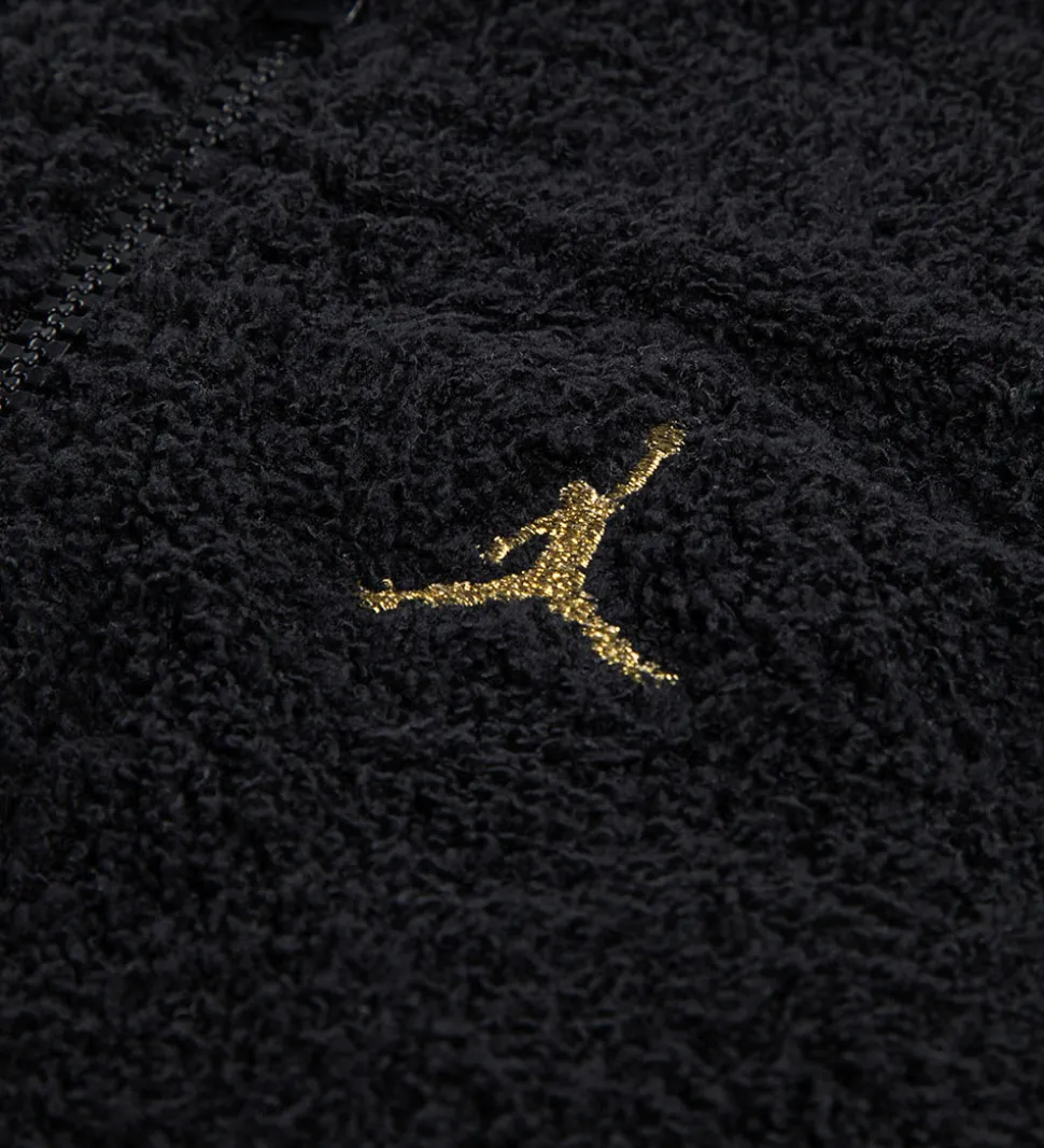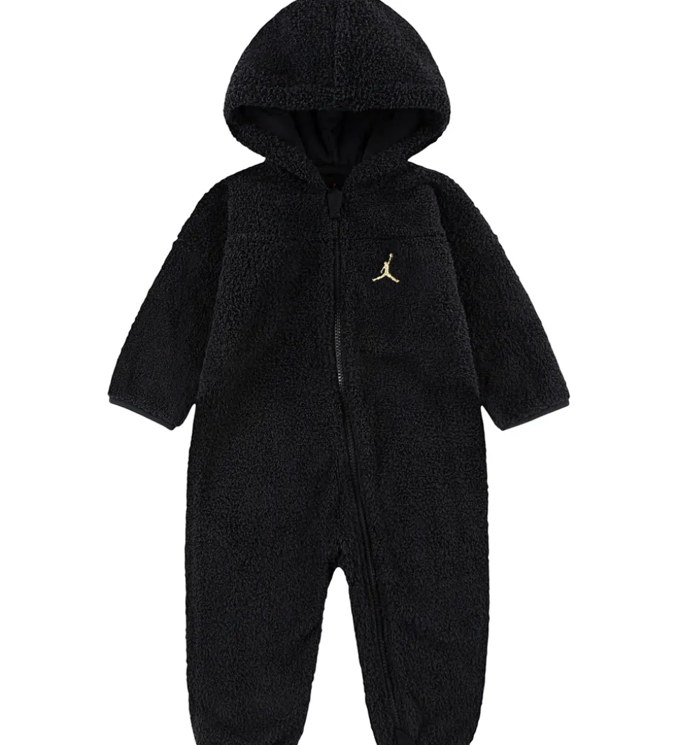 Lækker Jordan fleecedragt i sort teddyfleece, og fortil i venstre side er der broderet et guldfarvet logo.
