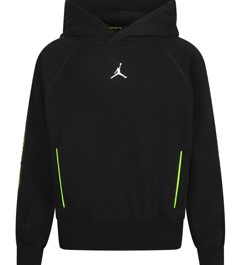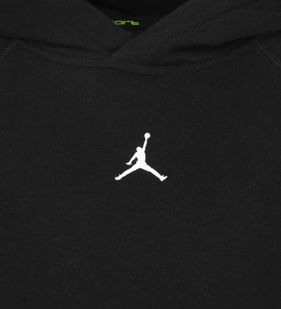 Lækker Jordan hættetrøje i sort med et hvidt logoprint fortil. Hættetrøjen har lange ærmer og en klassisk hætte, som giver et moderne look. På ydersiden af ærmerne er et smart logobånd, med teksten “Jordan Sport” i grøn, og fortil har hættetrøjen en praktisk kængurulomme.