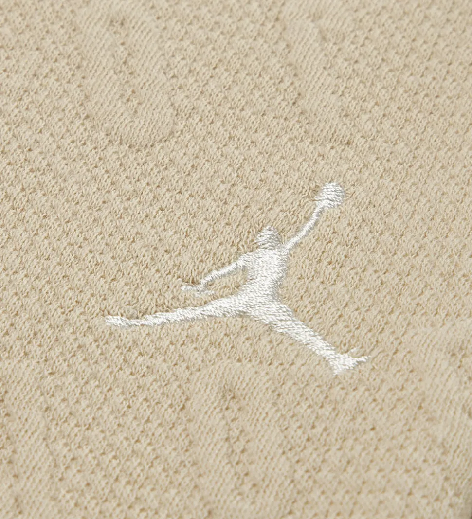 Elegant Jordan sweatsæt, der bestå af en sweatshirt og et par sweatpants i en ensfarvet beige nuance, der har et indvævet mønster med navn Jordan over det hele. Der er et diskret hvidt logo på både sweatshirten og sweatpantsene.