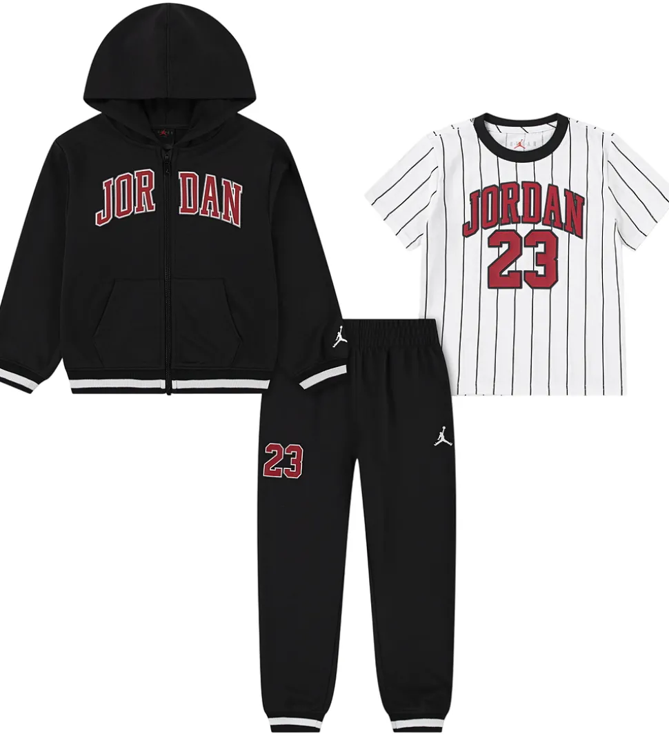 Lækkert Jordan sweatsæt, der består af en cardigan og et par sweatpants i sort sweat med røde detaljer samt en hvid t-shirt med smalle, sorte striber.