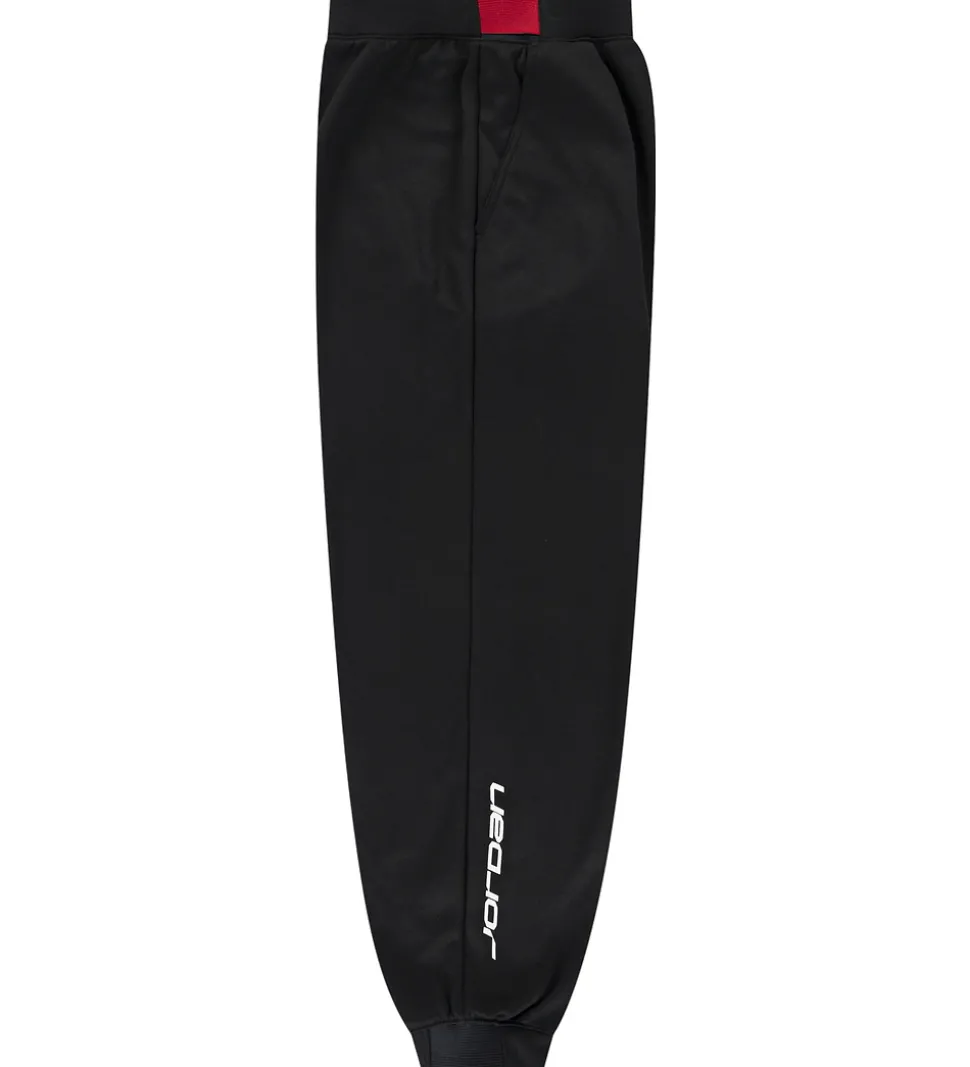 Smarte træningsbukser fra Jordan i sort med røde detaljer ved taljen, og nederst på højre buksenben er der et hvidt print. Jordan bukserne har en elastisk talje, der sikrer en behagelig pasform. Buksebenene afsluttes med brede ribkantet med elastik bagpå. I siderne er der praktiske lommer. Træningbukserne er lavet i en glatvævet, sporty kvalitet med en børstet bagside.