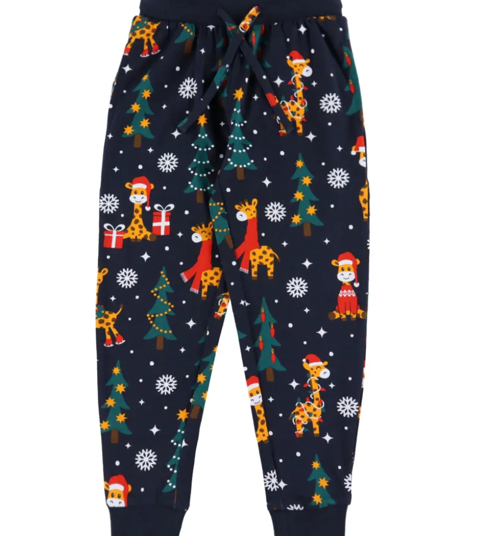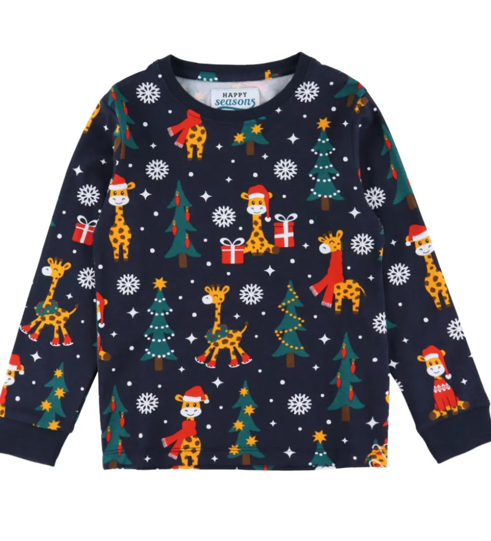 Skønt Jule-Sweaters nattøj i navyblå med et allover-juleprint. Nattøjet består af en bluse med en rund halsudskæring og lange ærmer. Den har en smal ribkant i halsen og brede ribkanter i ærmerne. Natbukserne har en bred elastik i talejn, og kan justeres med snører fortil. I benåbningerne er der brede ribkanter.