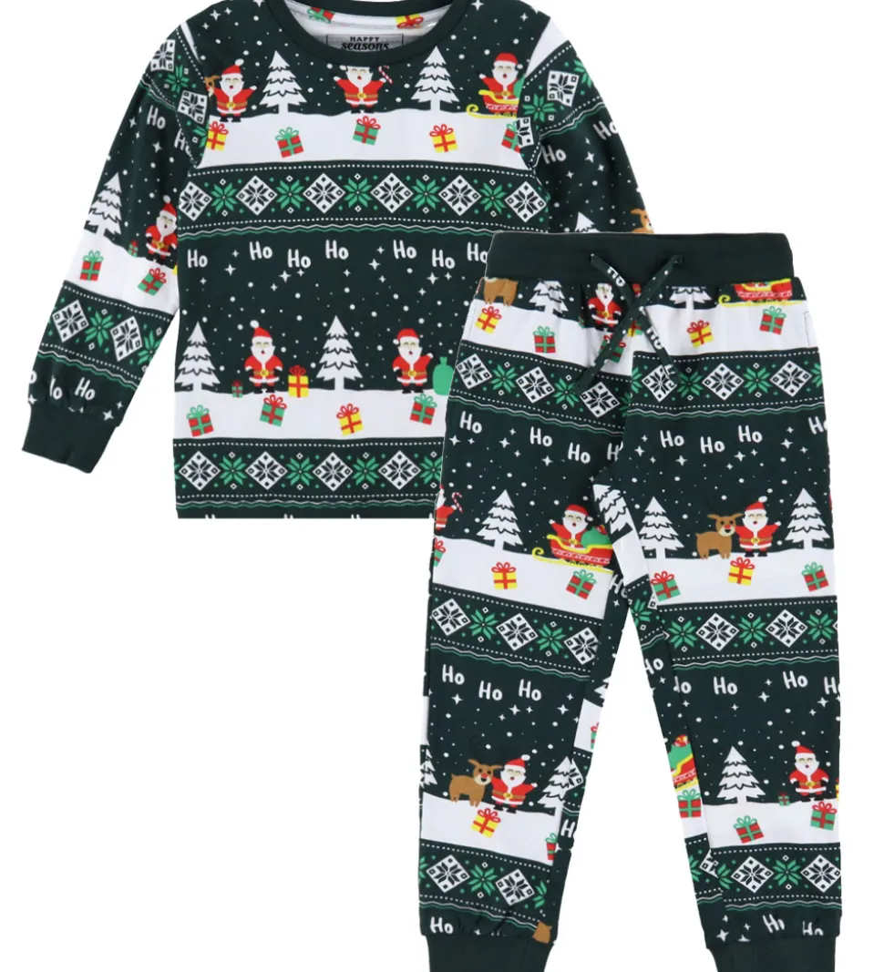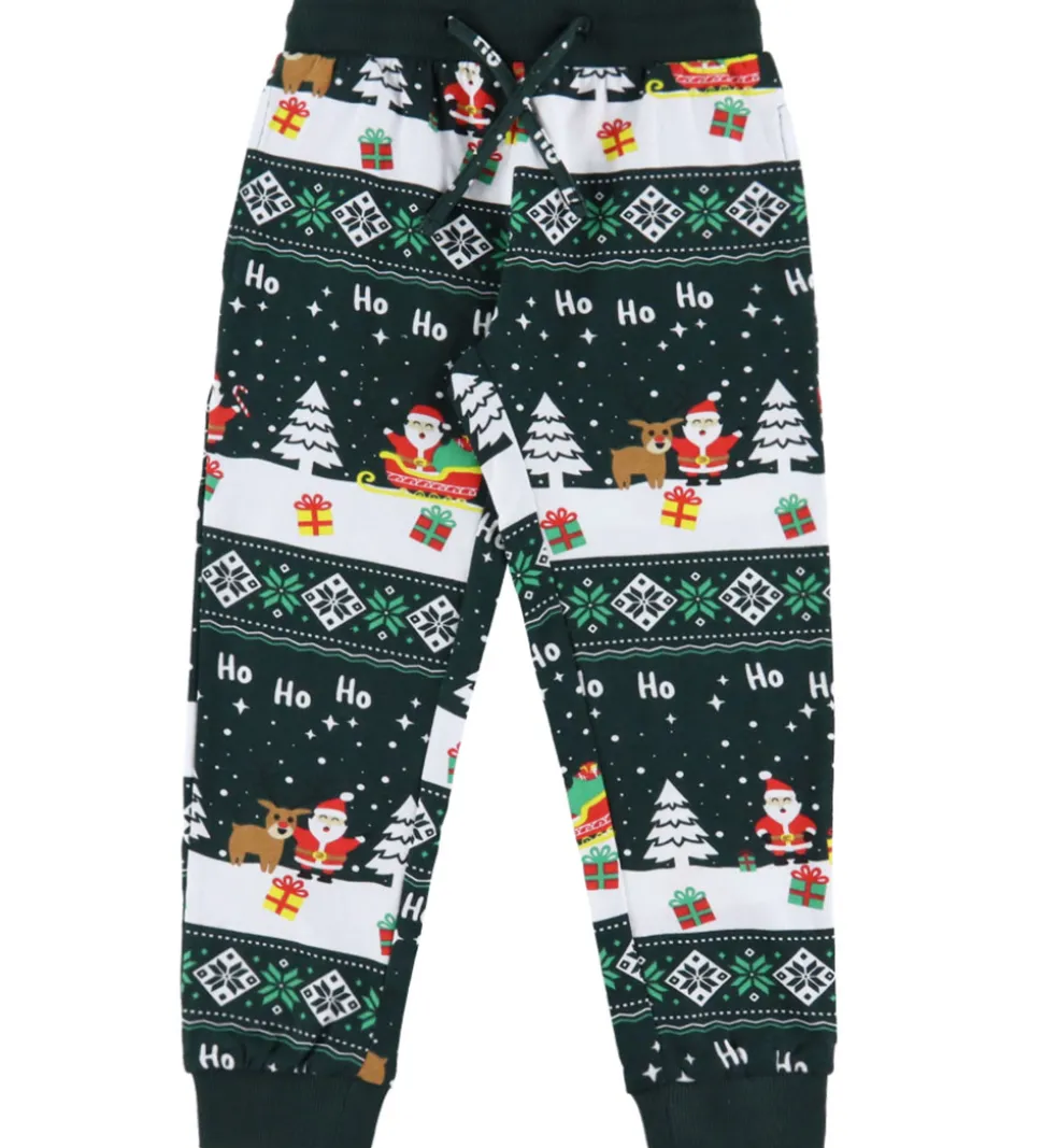 Festligt Jule-Sweaters nattøj i mørkegrøn med et allover-juleprint. Nattøjet består af en bluse med en rund halsudskæring og lange ærmer. Den har en smal ribkant i halsen og brede ribkanter i ærmerne. Natbukserne har en bred elastik i taljen, og kan justeres med snører fortil. I benåbningerne er der brede ribkanter.