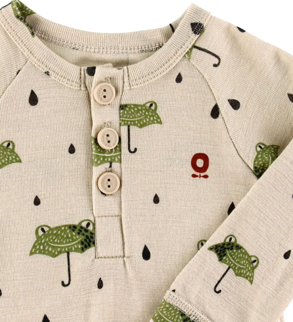 Charmerende Katvig heldragt i en lys beige nuance med et sødt, grønt print af frø-paraplyer og sorte dråber. Heldragten har en rund halsudsklæring og tre knapper foran. Den har lange lærmer og lange ben med brede kanter. Den lukkes mellem benene med trykknapper. Heldragten er fremstillet af økologisk merinould.