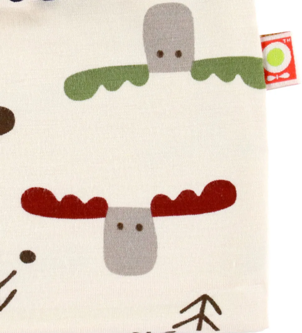 Charmerende Katvig hue i råhvid med et alloverprint af elgehoveder og logoer i forskellige farver. Huen har en rund hovedform og består af to lag. Den er fremstillet af bambus viskose.